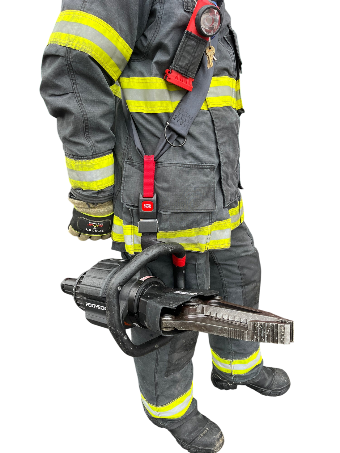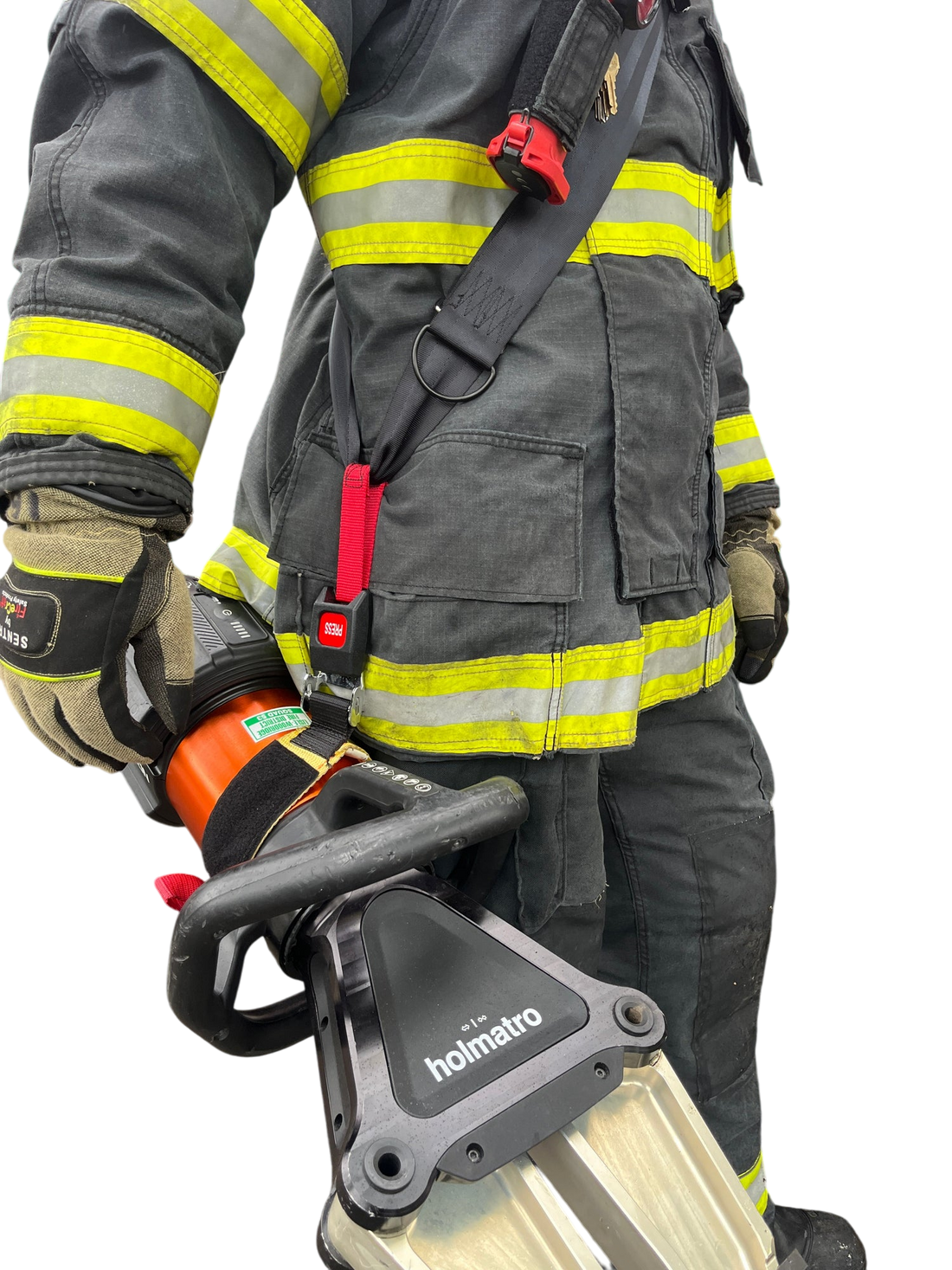 The extrication tool carrying strap was designed to assist firefighters when carrying battery powered extrication...