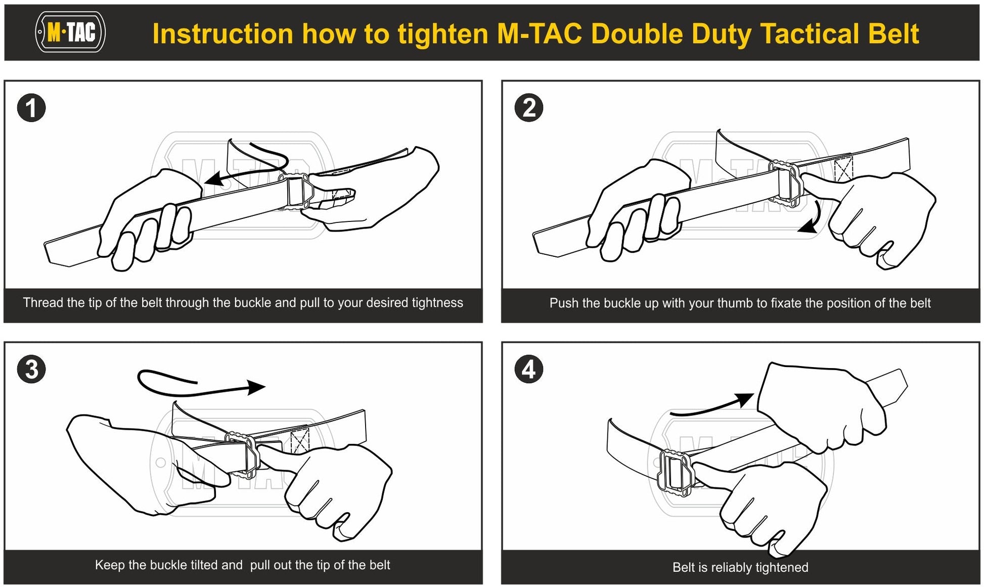 The M-Tac Double-Duty Tactical Belt is designed for continuous and long-term use. The belt consists of two durable nylon ribbons stitched together with a strong thread. The density of the material allows you to wear holsters and pouches on a belt. The belt is fixed on the waist with a universal buckle with hex relief on it made of durable polymer.