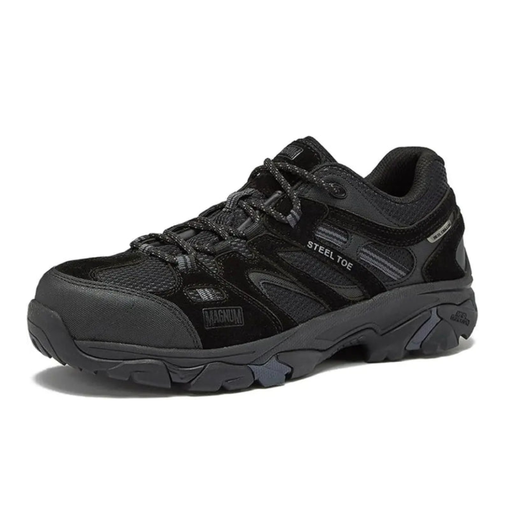 - SAFETY MENS WORK SHOES - The Magnum steel toe safety shoe is designed to protect your feet from injuries at work. Our safety toe shoes for men are tested in accordance with ASTM 2412-18a for impact resistance, so you can be sure your feet are protected.