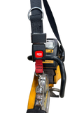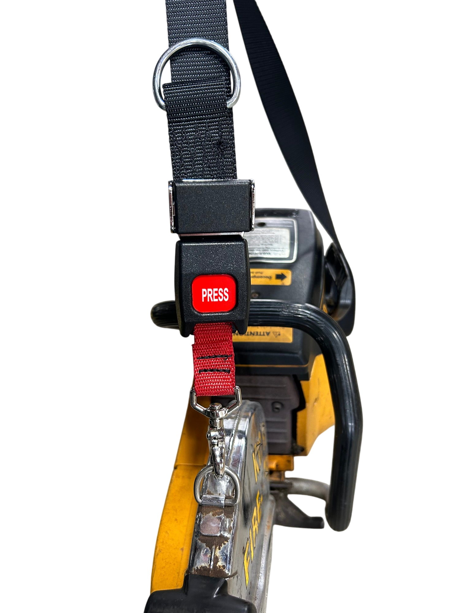 This saw carrying strap was designed to assist firefighters with carrying a K12 or rotary saw. There are spring clips on each end to connect to the rings on the saw. The strap is also designed with 2 seatbelt buckles so it can be quickly removed when it is time to go to work. It is imperative that firefighters maintain 3 points of contact when climbing a ladder and not all saws come with a carrying strap. The saw carrying strap allows firefighters to climb a ladder safely with the saw slung to their side or around their back.