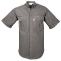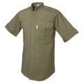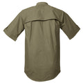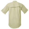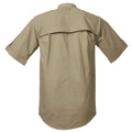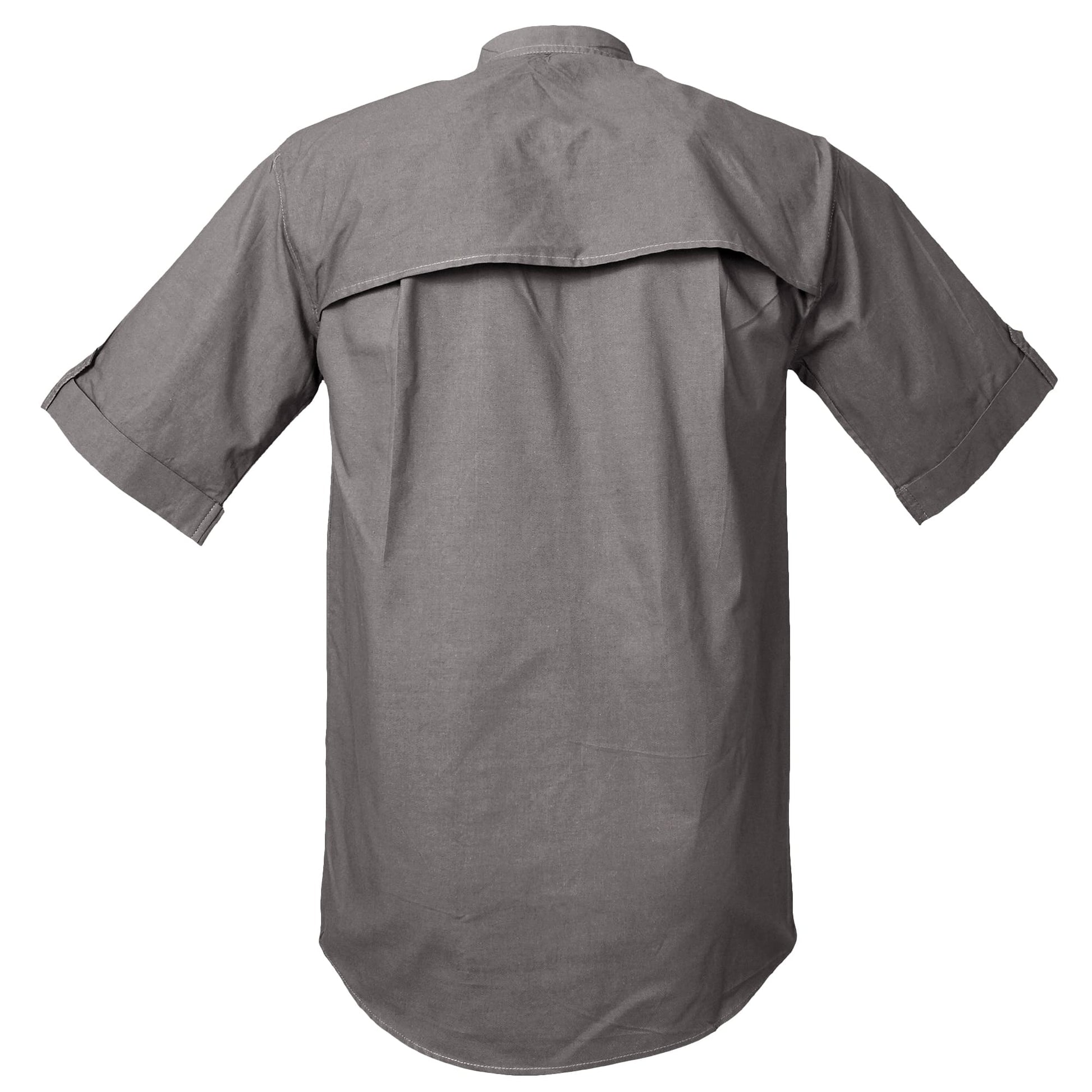 Men's Safari Adventure shirt with Vented Back in short sleeves is the ideal safari shirt for your African outdoor travel experience. The mesh lined vent back circulates air to keep you cool. Two chest pockets with button down flaps carry essential outdoor gear. Safari style roll up tabs add a classic finishing touch to the sleeves. Button down collars stop the wind from blowing collar points in your face. Double stitched throughout for durability, with generous sizing and long tails that stay tucked in. Made in Africa from 5 1/2 ounce pre-washed and pigment dyed cotton for a natural worn look.