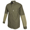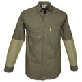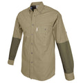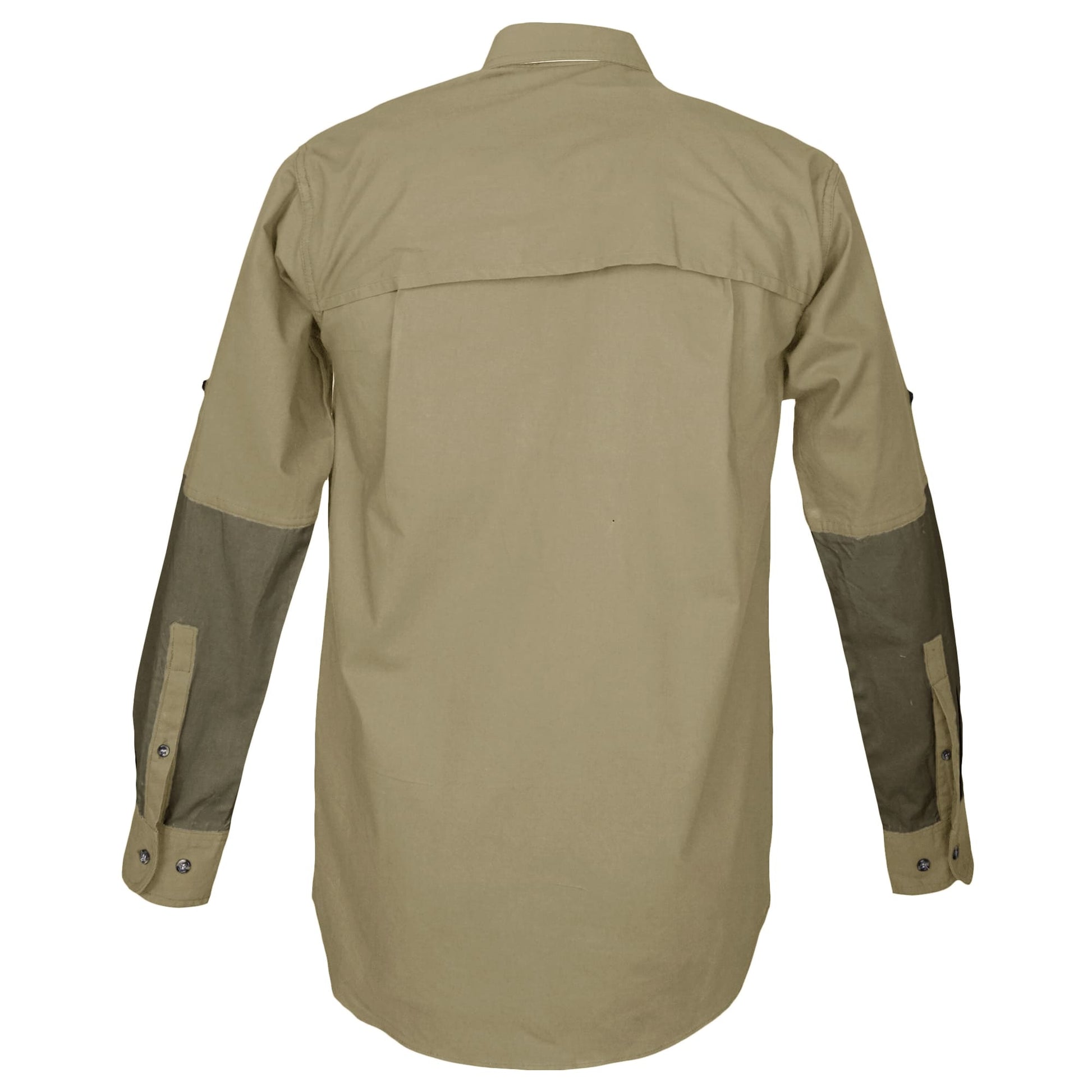 Clay Bird Shirt for men in long sleeves is a rugged safari shirt specifically designed to compliment a day of competitive trap shooting at the range. The mesh lined vent back circulates air to keep you cool. The quilted shooter patch is sewn on the inside of the shirt to cushion recoil and keep your gun from getting hung up. An FITASC competition shooter's line is sewn at regulation level to mark rested gun position. A single chest pocket with button down flap carries essential hunting gear. Button down collars stop collar points from hitting your face when firing on windy days. Made in Africa from pre-washed and pigment dyed 100% cotton for easy care and a natural worn look. This men's Long sleeved clay bird shirt will round out an afternoon of skeet shooting with friends at the local gun club.