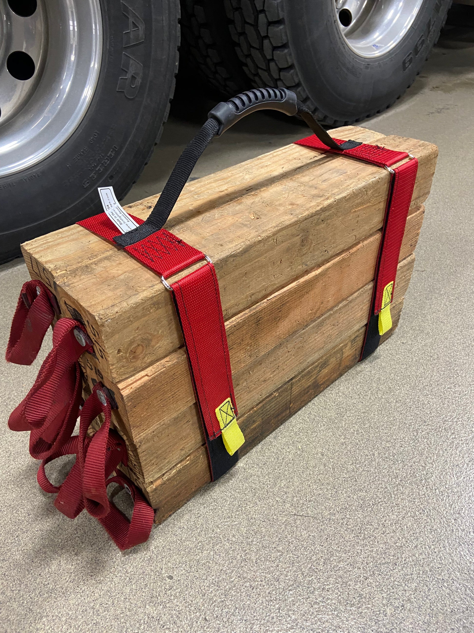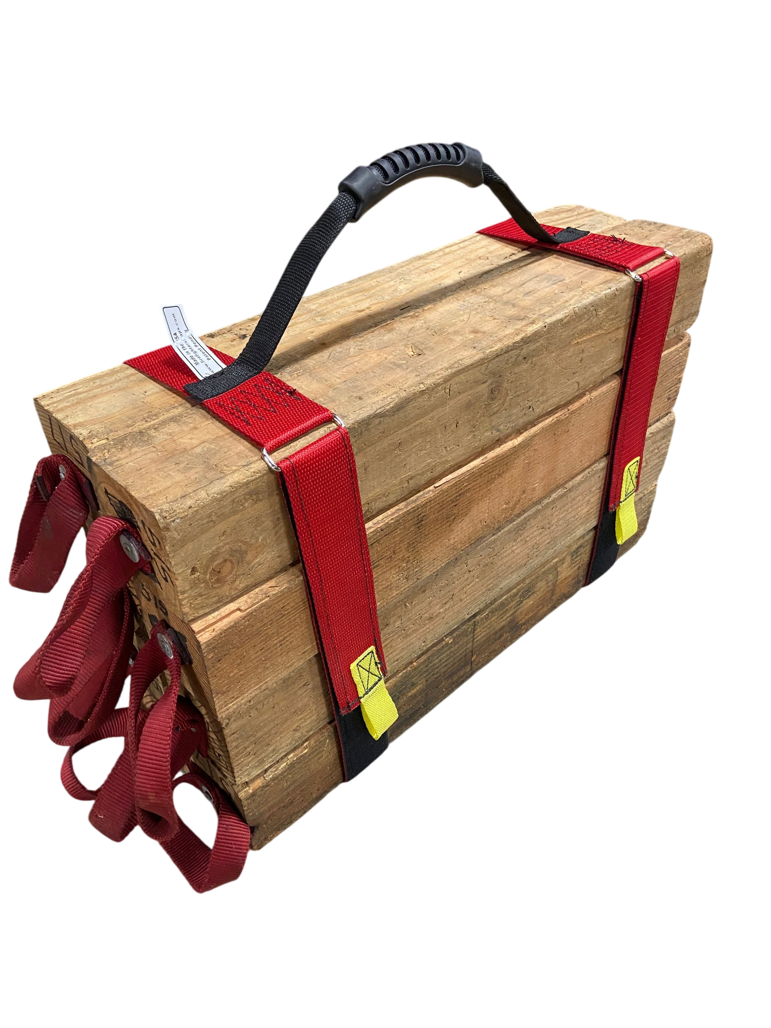 The Cribbing Strap Short - FFCS8 is designed to bundle and organize cribbing materials efficiently for clean storage and easy transport to the incident scene. This durable strap securely holds 8 to 9 pieces of cribbing together, ensuring they stay compact and manageable during transit. In addition to cribbing blocks, wedges and base plates can also be fastened within the bundle, providing versatile storage for critical stabilization tools. Built with strength and convenience in mind, this strap helps streamline fire and rescue operations by keeping essential equipment readily accessible and neatly contained.
