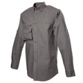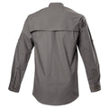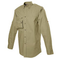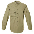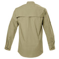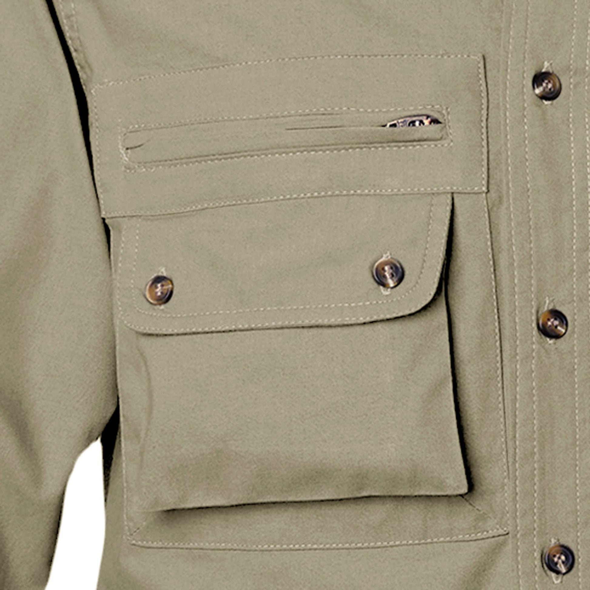 Vented back left-hand hunter shirt for men in long sleeves is made for left-handed shooters going on an African hunting safari. The mesh-lined vent back circulates air to keep you cool, and the quilted shooting pad on the shoulder effectively cushions gun stock recoil. Two chest pockets, one with buttoned flap and one with zippered closure, safely and effectively carry permits, travel papers, and other essential outdoor gear. Button-down collars keep collar points in place and on windy days. Double-stitched throughout for durability, with generous sizing and long tails that stay tucked in. Made in Africa from pre-washed and pigment dyed 5 1/2 ounce cotton for easy care and cool comfort. This men’s long-sleeved left-handed shooter's shirt with shooting patch and vent back is perfect for the adventurer in you.