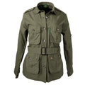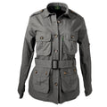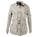 Safari Jacket for women is an authentic African original made from light weight 5 1/2 ounce cotton fabric. Layer over a T-shirt or hunting shirt for cool comfort. Two buttoned flap covered chest pockets and two cargo pockets at the waist provide ample storage for essential outdoor gear. Cross-stitched epaulettes keep a pair of binoculars or a canteen from sliding off your shoulder. Functional Swiss tabs keep sleeves neatly rolled up. Full buttoned front and belted waist for a classic safari look. Not your grandfather's heavy jacket. Made in Africa from garment washed and pigment dyed cotton. Generously sized for comfort. Worn alone or over other clothing, this women's safari jacket is the real deal and the choice of explorers, guides, and big game hunters the world over.