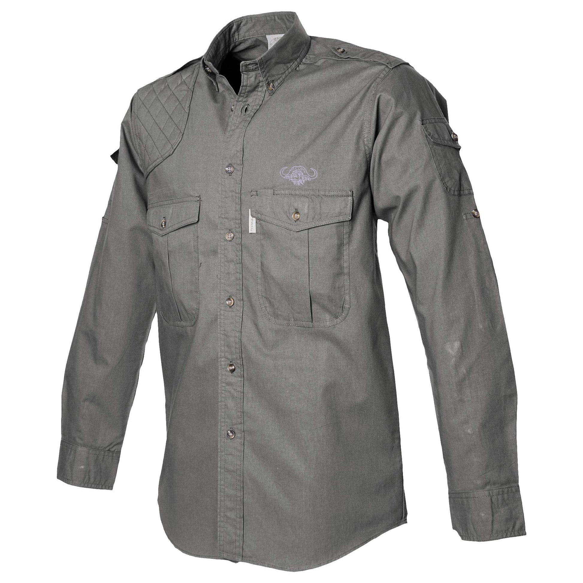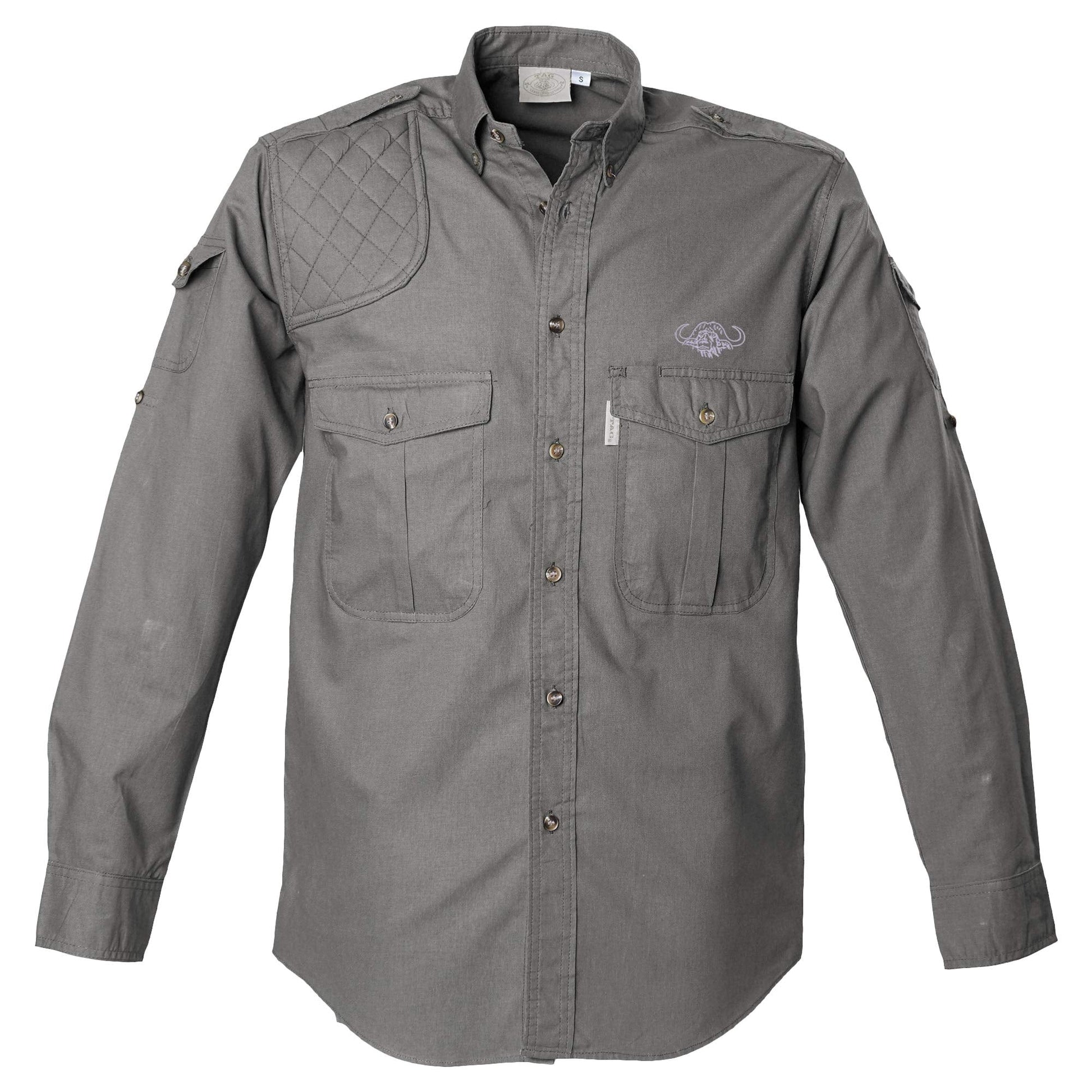 Shooter Shirt for men in long sleeves, with shooting patch and shoulder epaulettes, is an authentic African big game safari shirt inspired by great hunters such as Courtney Selous. The diamond quilted shooter patch effectively cushions gun recoil. Two pleated chest pockets with button down flaps carry essential hunting gear. Two smaller pockets with button down flaps on the sleeves hold ammo and other needed supplies. Functional cross-stitched epaulettes prevent a gun sling or binoculars from slipping off your shoulder. Button down collars stop shirt collar points from striking your face when hunting on windy days. Double stitched throughout for durability, with generous sizing and long tails that stay tucked in. Made in Africa from rugged, lightweight 5 1/2 ounce cotton for cool comfort. This men's short sleeved shooting shirt was made for your ultimate safari experience.