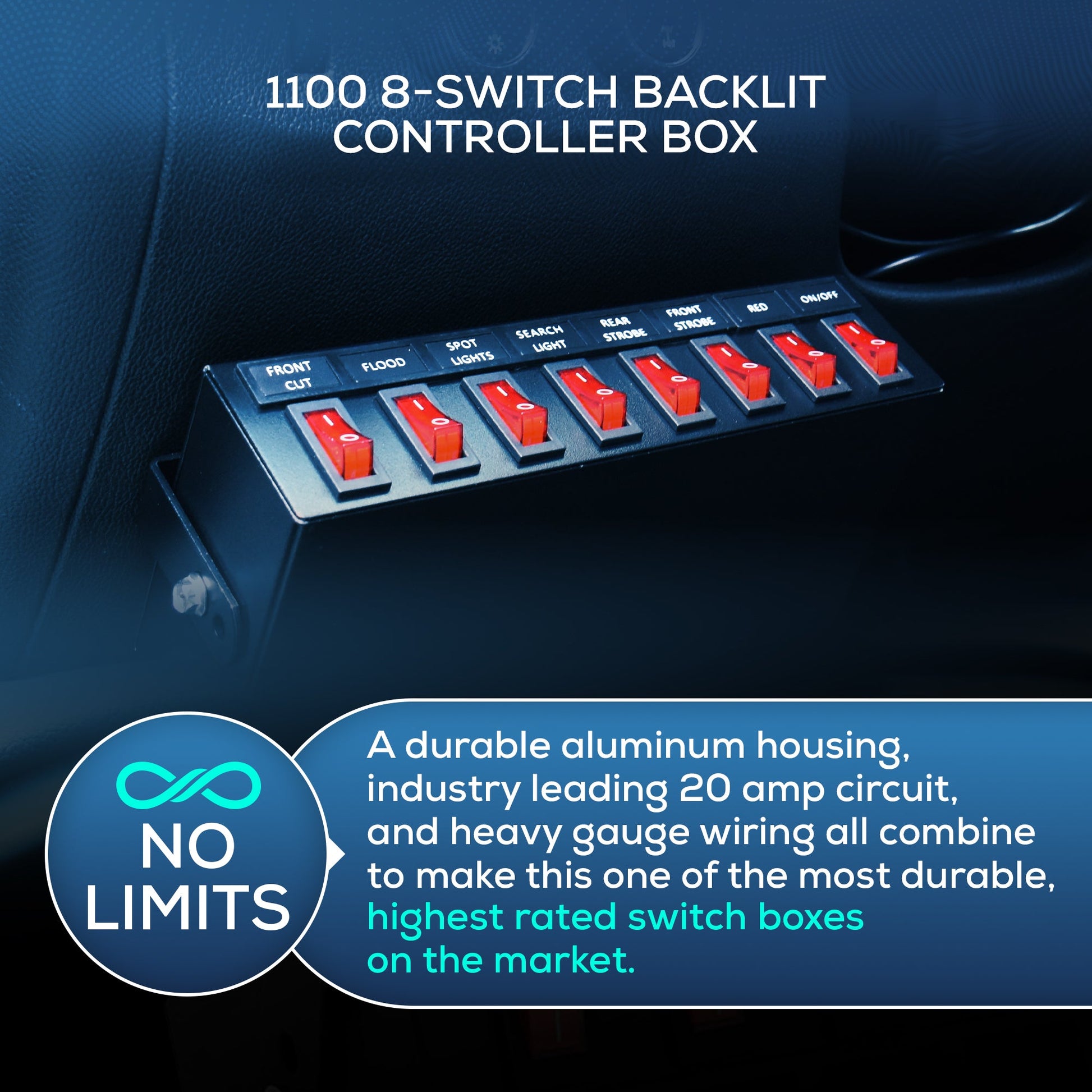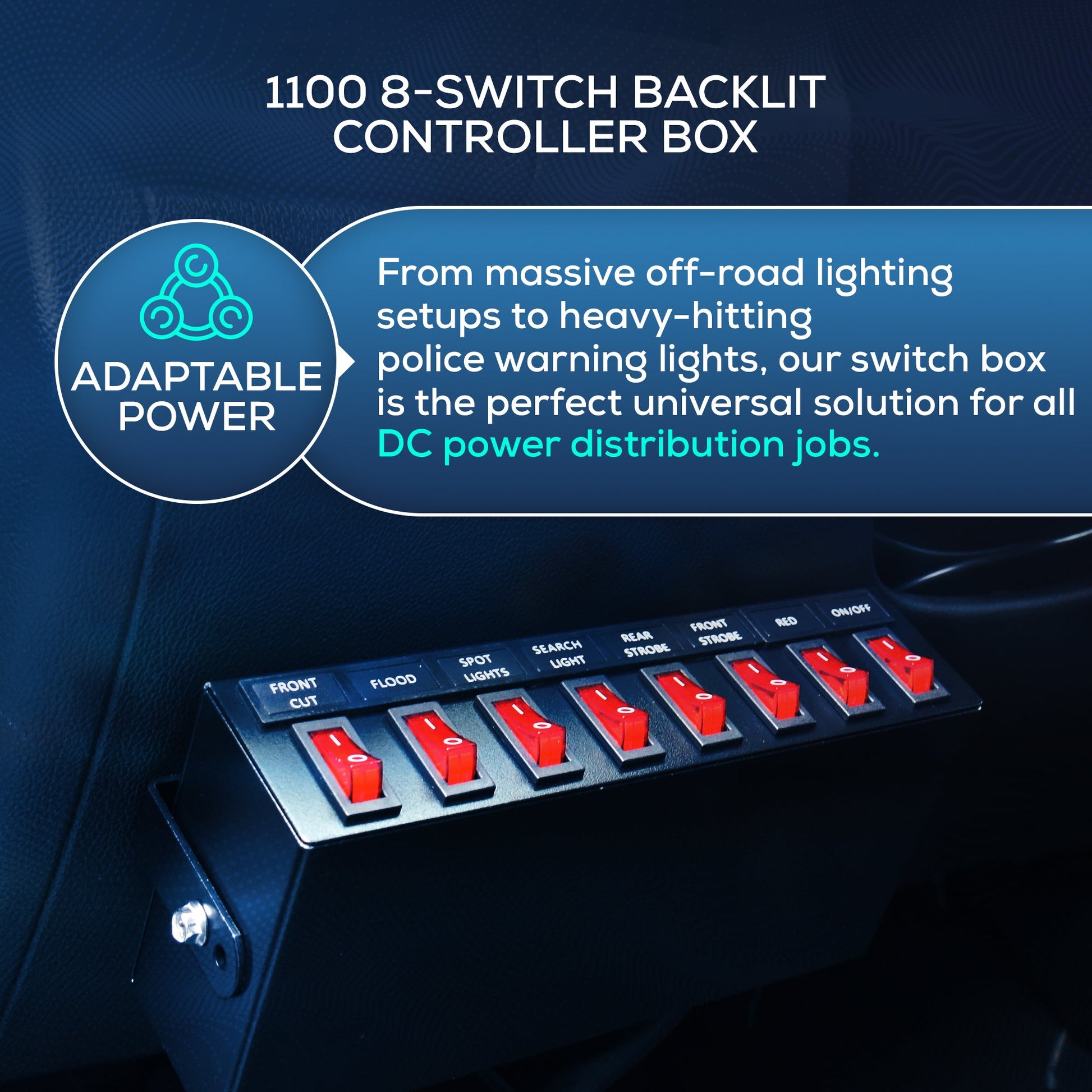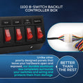 Featuring eight back-lit buttons, the UBL 1100 Switch Box makes it easy to identify which switch is activated, even in low-light conditions. The backlighting not only enhances visibility but also adds a sleek, modern touch to your vehicle's interior, making nighttime operations more manageable and efficient.