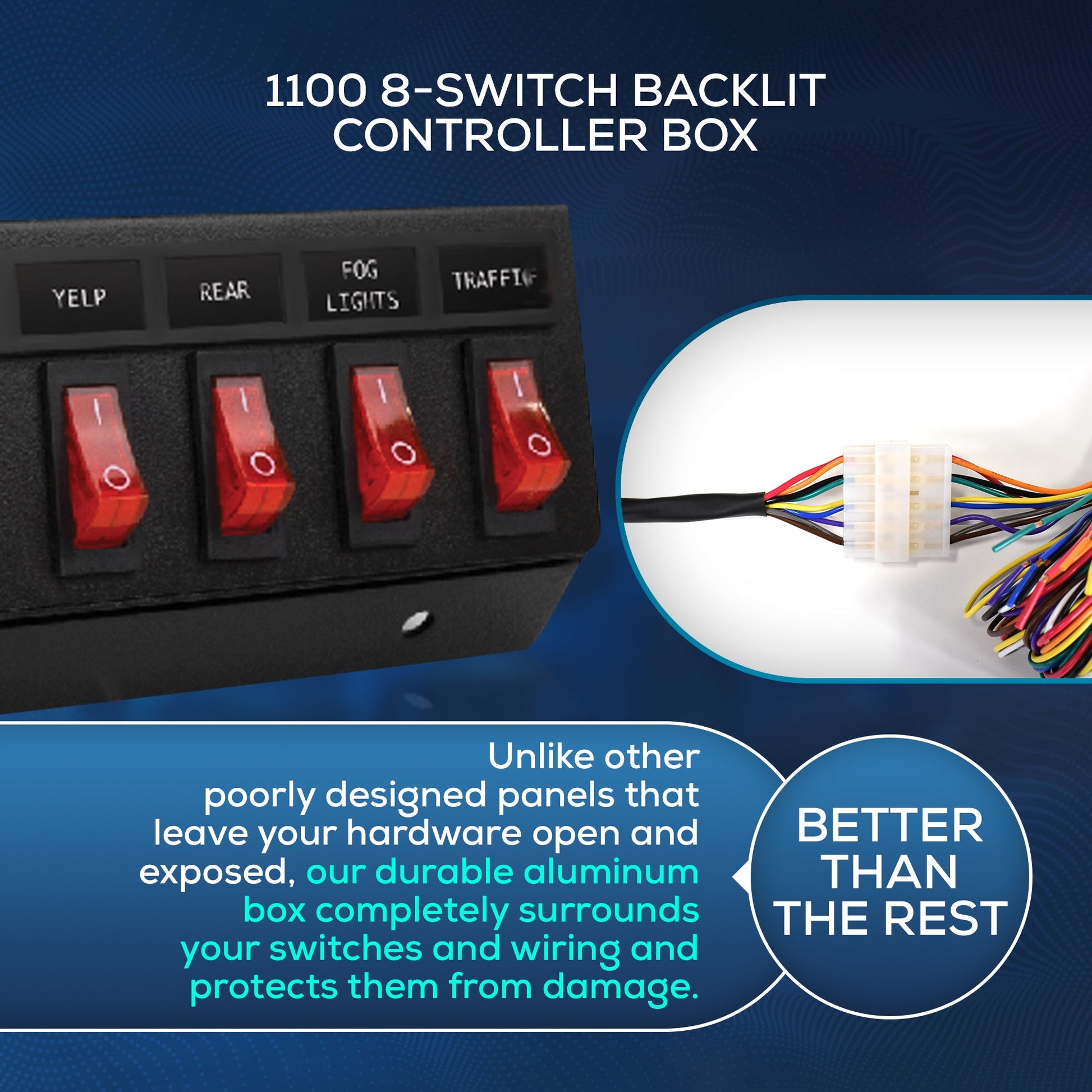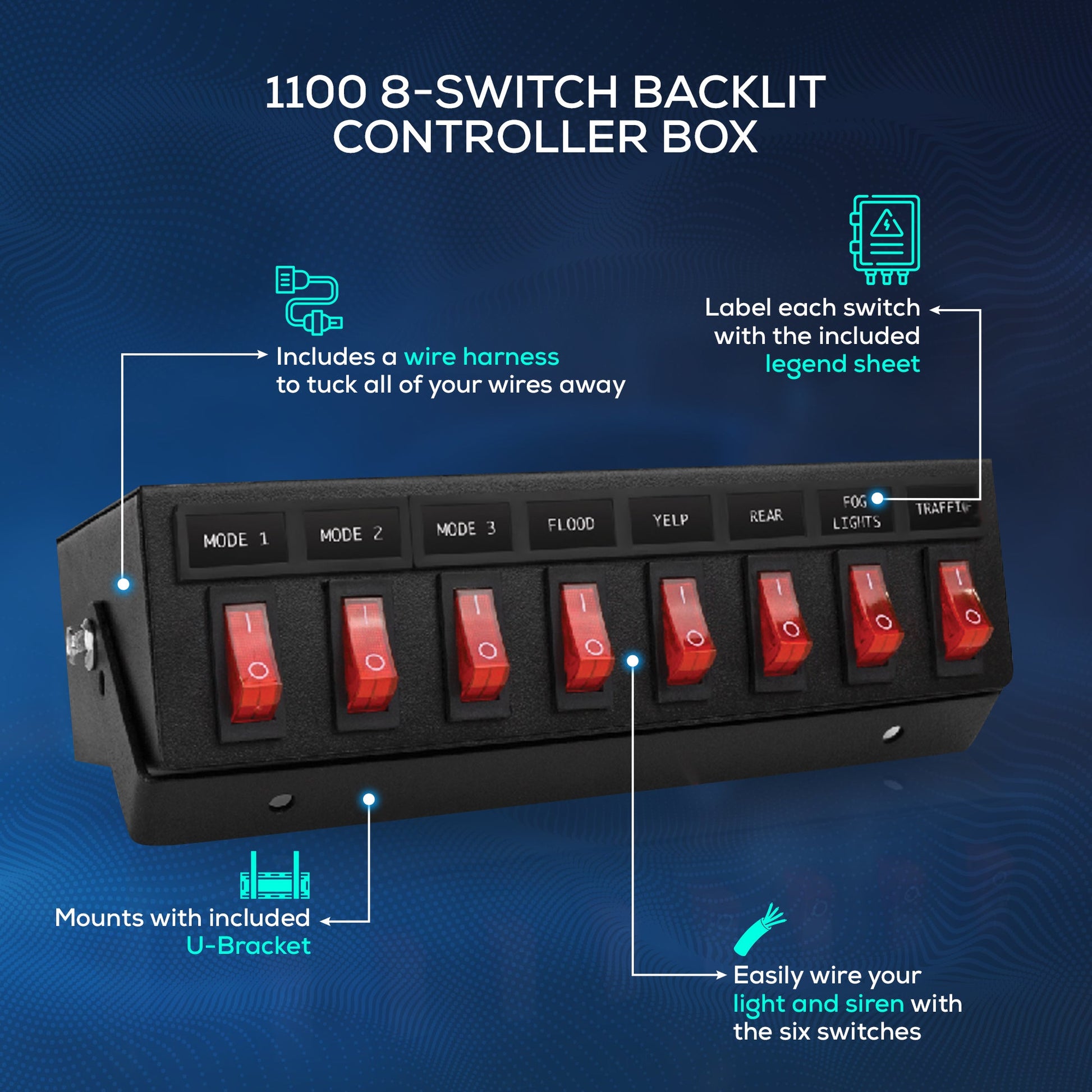 Improve your vehicle's control system with the UBL 1100 8-Switch Box, the perfect solution for managing lights, sirens, and other electronic devices. This highly versatile switch box provides seamless control, significantly enhancing the functionality and efficiency of your vehicle.