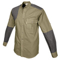 Upland Shirt for men in long sleeves is a 100% cotton wing shooting shirt with contrast details for style and safety. The quilted shooter patch effectively cushions gun recoil. A single chest pocket with button down flap carries essential hunting gear. Swiss tabs keep sleeves neatly rolled up in the midday sun. Button down collars stop collar point from hitting you in the face when hunting on windy days. The contrasted shooting pad, sleeves, and yolk enhance visibility when moving through thick brush. Double stitched throughout for durability, with generous sizing and long tails that stay tucked in. Made in Africa from pre-washed and pigment dyed 5 1/2 ounce cotton for a natural worn look. This men's long sleeved upland bird shooting shirt will serve you well and keep you safe when stalking game in the field.