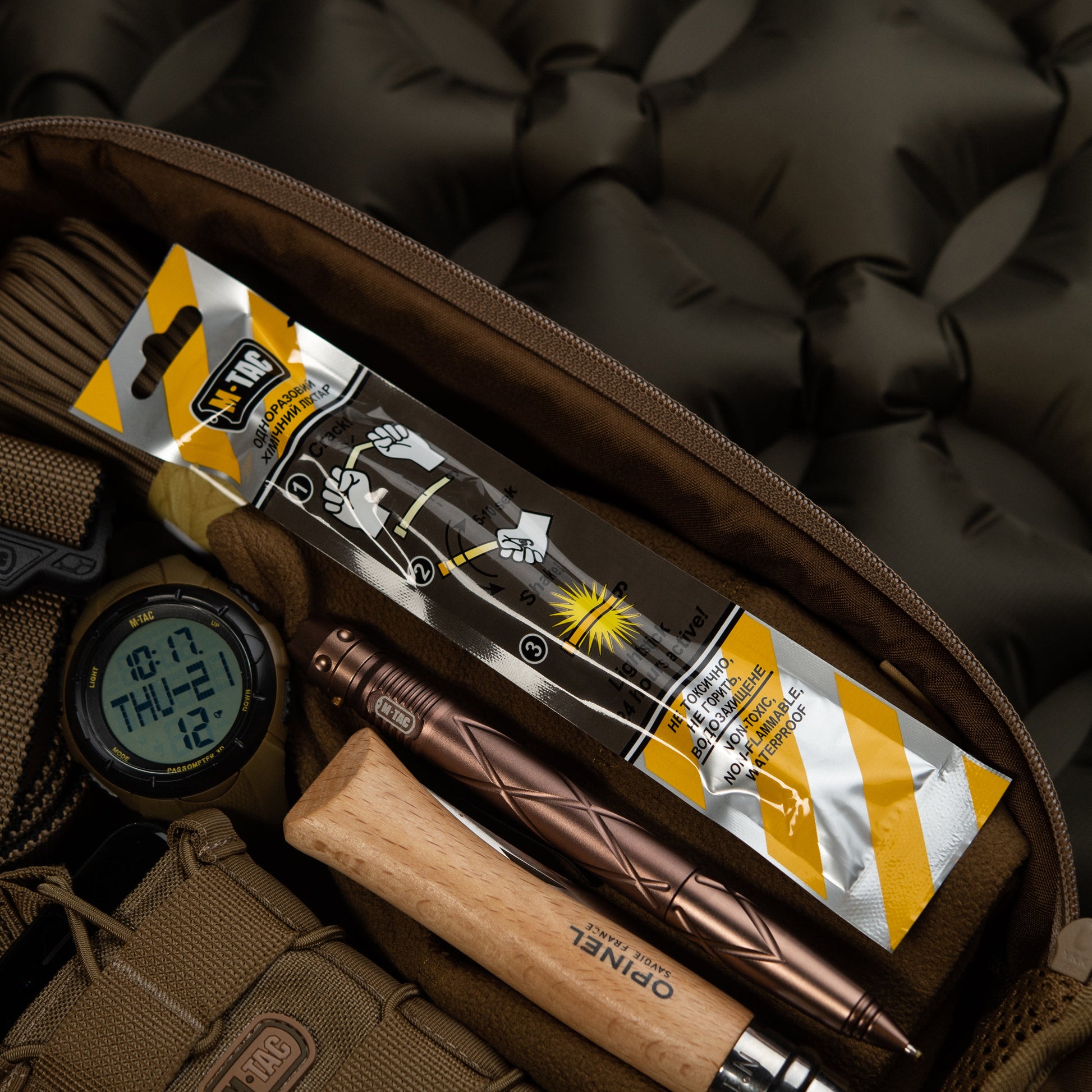 The M-Tac glow stick is a completely self-contained light source that works without electricity and helps to illuminate dark places, mark a point or give a signal. The disposable tube can illuminate a small area for 24 hours after activation. Safe, non-toxic, and non-flammable chemical components are contained in a sealed case and can be stored for a long time without losing their properties. It is widely used in military practice, tourism, diving, and is also used as various kinds of backup lighting.