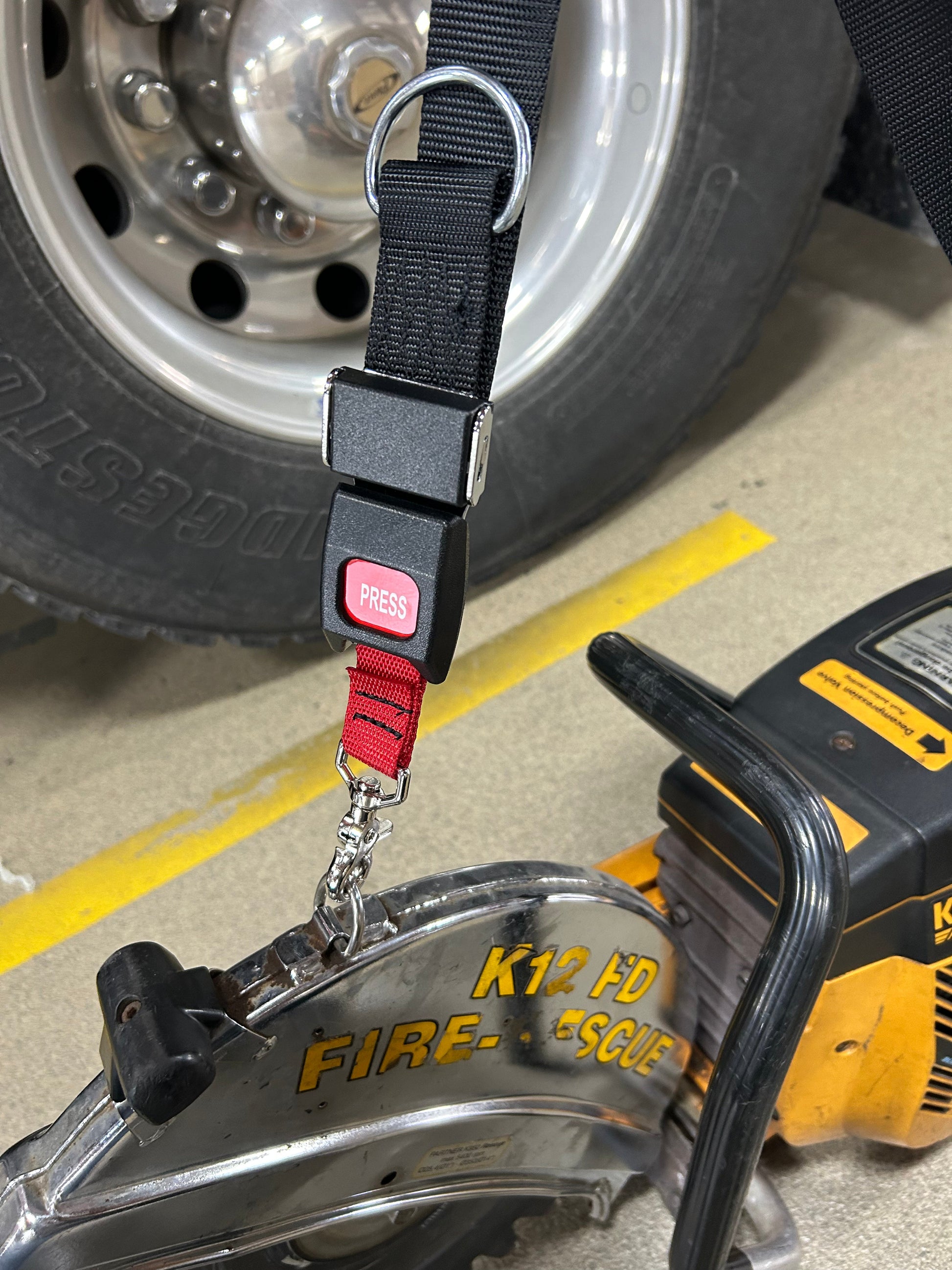 This saw carrying strap was designed to assist firefighters with carrying a K12 or rotary saw. There are spring clips on each end to connect to the rings on the saw. The strap is also designed with 2 seatbelt buckles so it can be quickly removed when it is time to go to work. It is imperative that firefighters maintain 3 points of contact when climbing a ladder and not all saws come with a carrying strap. The saw carrying strap allows firefighters to climb a ladder safely with the saw slung to their side or around their back.