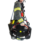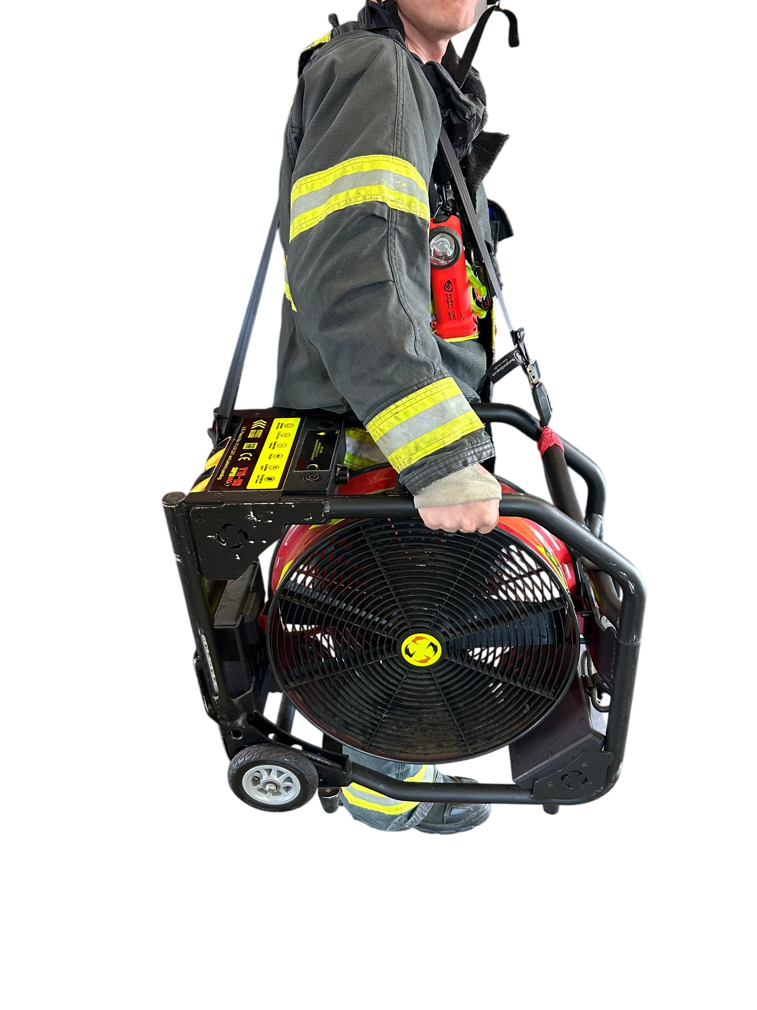 The fan carrying strap was designed to be used with fire service fans to help firefighters carry fans up stairs or over terrain that does not allow the fan to roll. The sling is quickly removable with the click of a seatbelt buckle and adjustable at both ends. The female seatbelt buckles are installed on the fan by girthing the 1" webbing loop around the fan frame. The female buckles stay on the fan all the time and if the need to carry the fan arises, the firefighter quickly clips the sling into the buckles. The sling can also be used to hang the fan if needed.