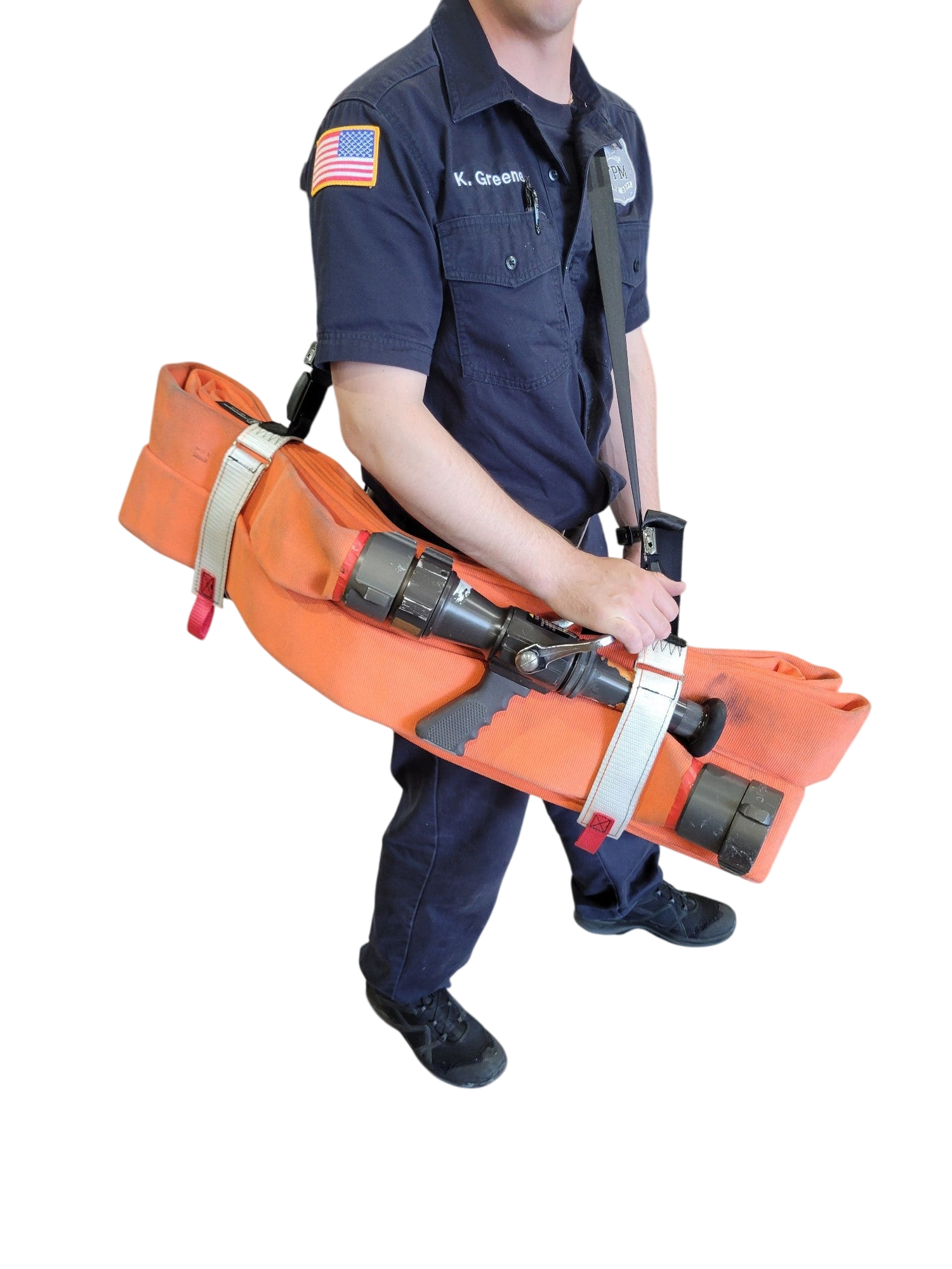 This hose bundle strap kit is designed specifically for the New York Fold or New York High Rise Pack. It is comprised of 2-31” hose straps with female seatbelt buckles sewn onto them. The sling has male seatbelt buckles on both ends that clip into the hose straps for ease of carrying. The sling is adjustable on both ends with large D-rings that are easily grasped with a gloved hand. While this strap kit was designed for the NY high rise pack, it can be used on any hose bundle with a circumference of 20”-24”. The Design of all of our hose straps allows the bundle to be cinched tight without loosening up.