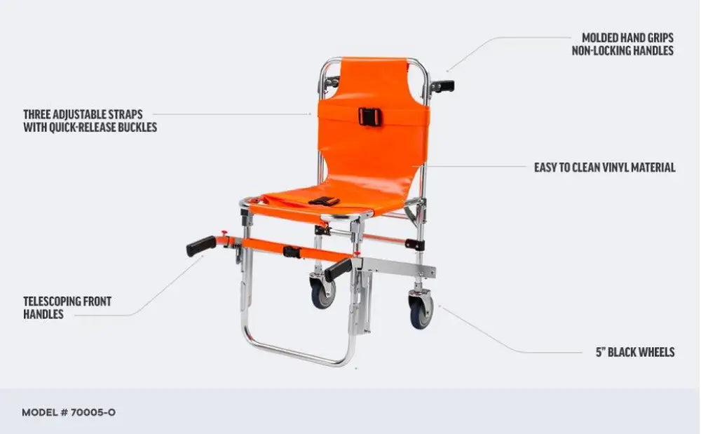 LINE2design EMS, Emergency Evacuation Standard 2 wheel evacuation stair chair, comes with a heavy duty orange vinyl protective cover that is durable and easy to clean along with 3 heavy duty quick release restraint straps to secure individuals during transport or while moving the patient up or down stairs. This stair chair features 2 – 5″ rear wheels that make for easy transport on most surfaces, as well as front and back handles for easier handling, the back 2 handles are used to support the chair while moving the patient, the back two handles are non-locking and used for upward lift. The front two handles on the evacuation stair chair, telescope out and lock into place to provide the best possible leverage when lifting the patient.  The 3 safety straps should be used at all times while a patient is in the chair and it is recommended to always use the standard 2 wheel stair chair with 2 people for added safety.