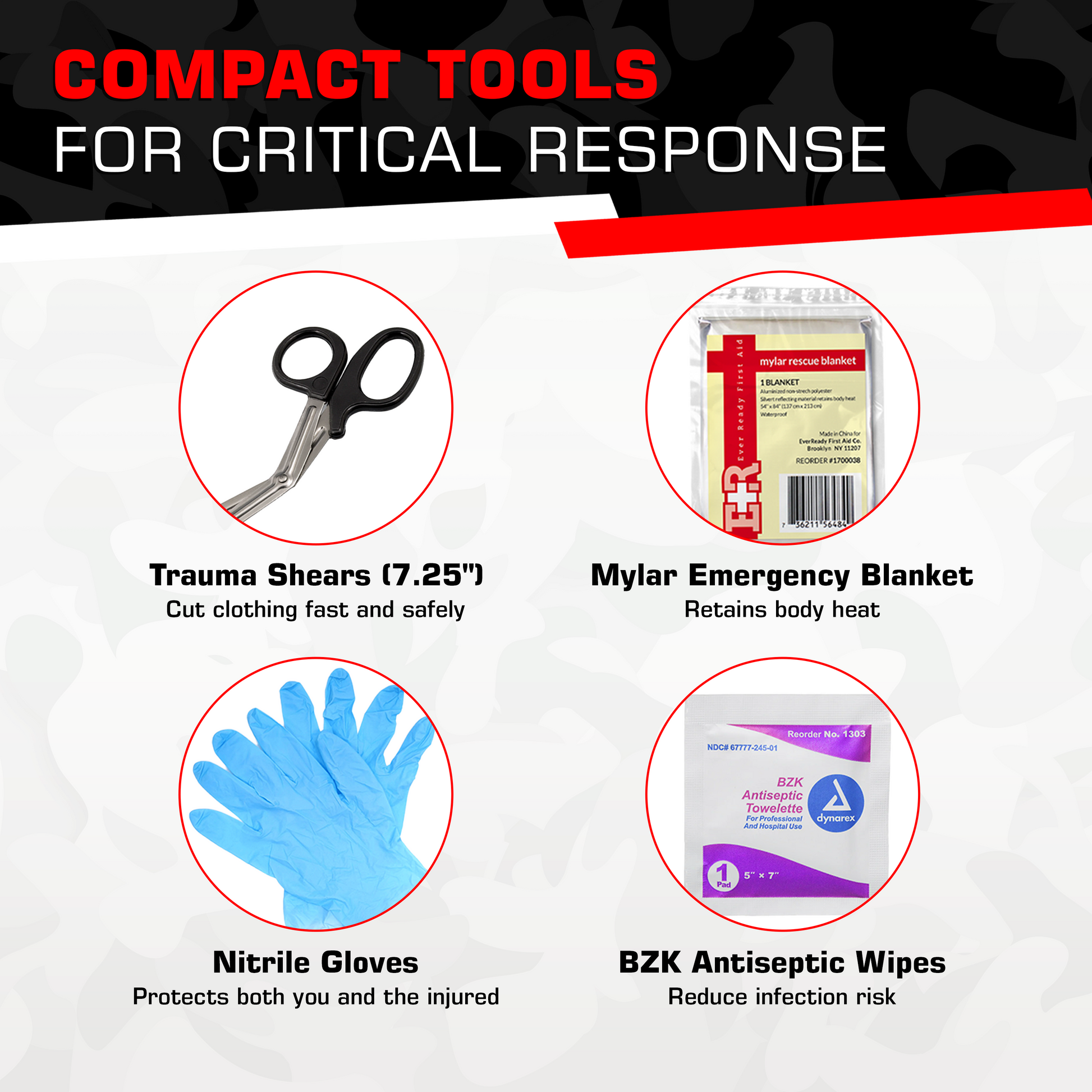 Includes SWAT-T tourniquet, emergency bandage, and compressed gauze for critical bleeding response.