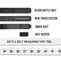 Outer Battle Belt is Nylon Web flanked by two rows of Molles, a Super-Fiber inner lining & proprietary Reinforced Power-Core™ center. The Inner Velcro Liner belt is nylon web & feeds thru belt loops to hold up your pants & support the weight of the outer Battle belt. The 2 belt system works in unison to adjust the belt's size - in and out - and they must be used together.