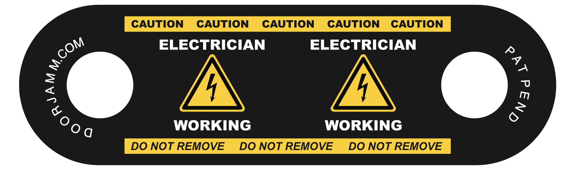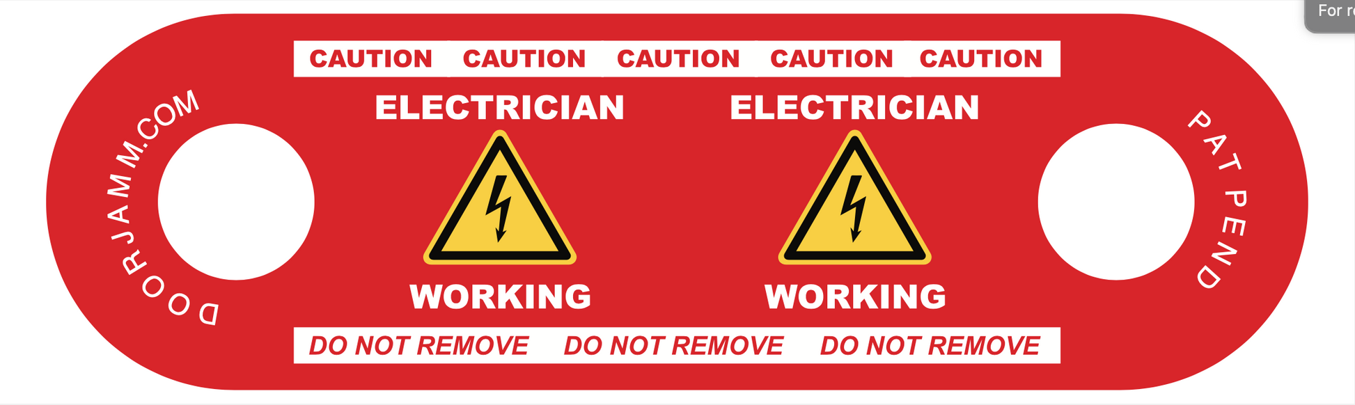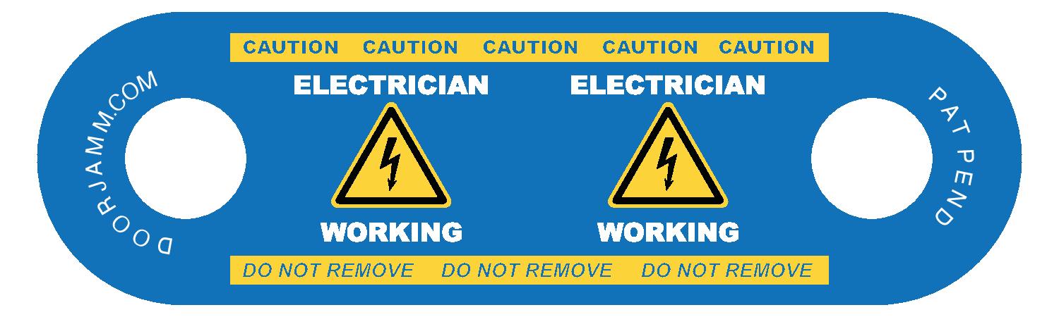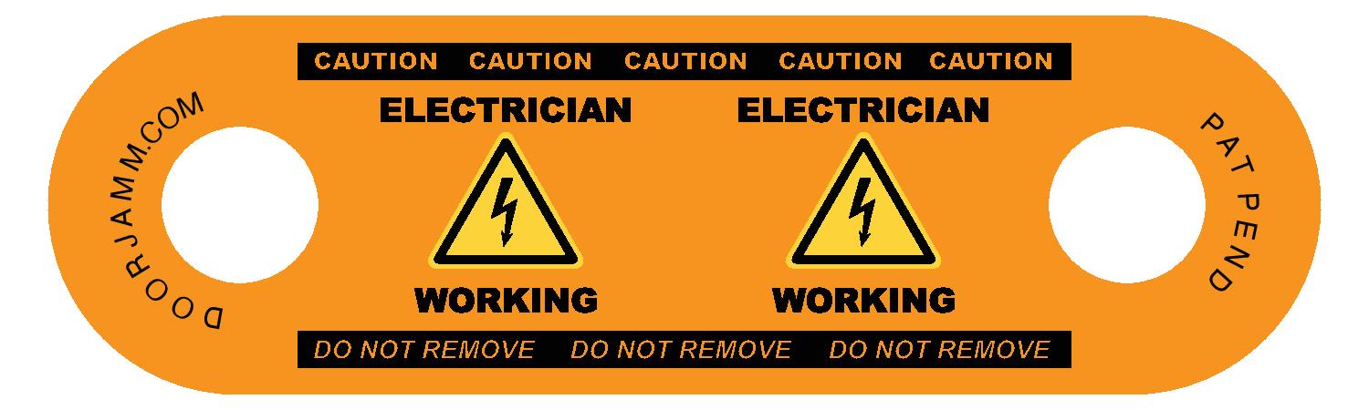 This printed DoorJamm is clearly marked with "ELECTRICIAN WORKING" with a warning symbol on both ends and "CAUTION" + "DO NOT REMOVE" on one side.