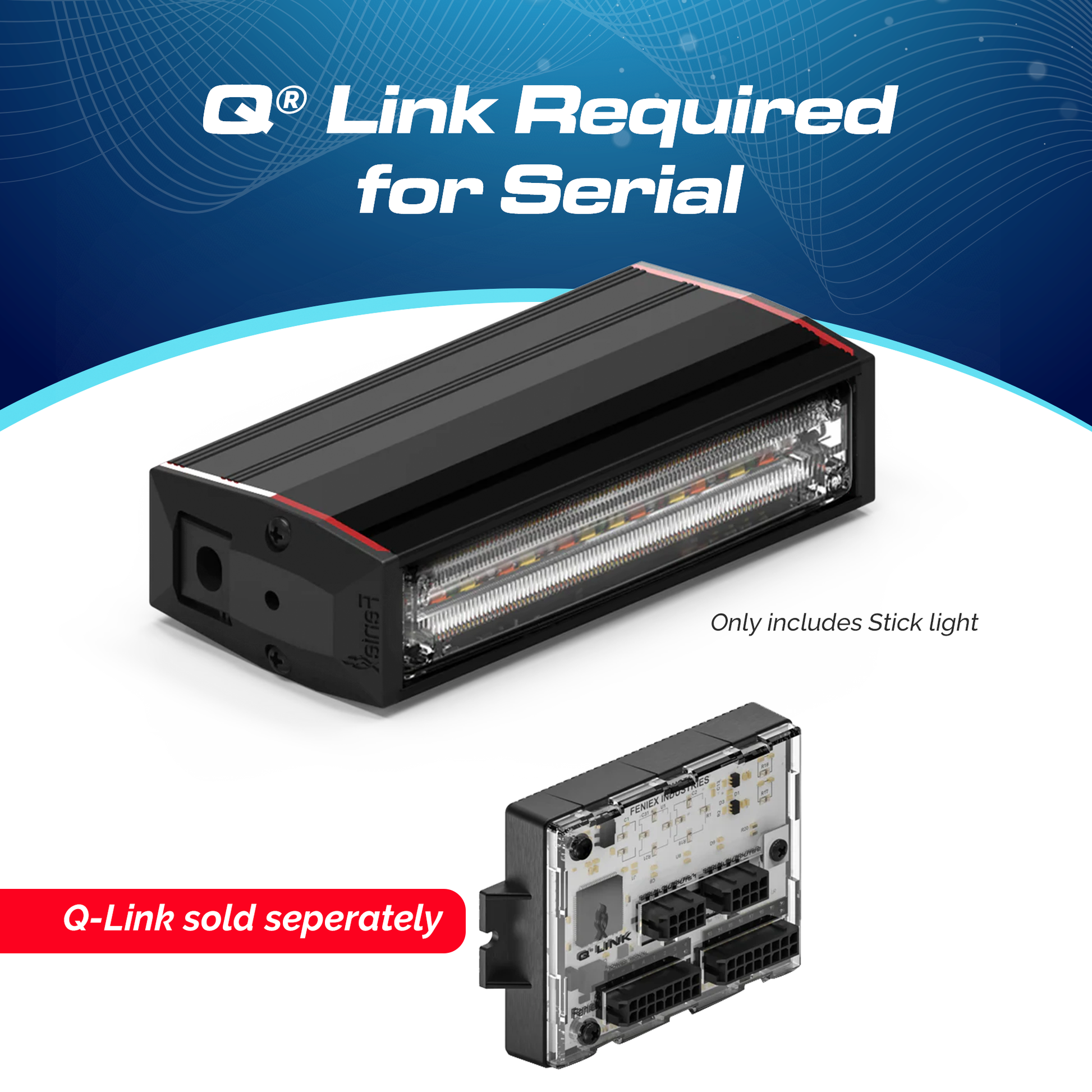 The Feniex Q Serial 100 Stick incorporates advanced serial technology, connecting via two serial wires to the Q-Link device. You can sync up to 48 lightheads to the Q-Link device and program any function and color using our intuitive Q-Link Software.