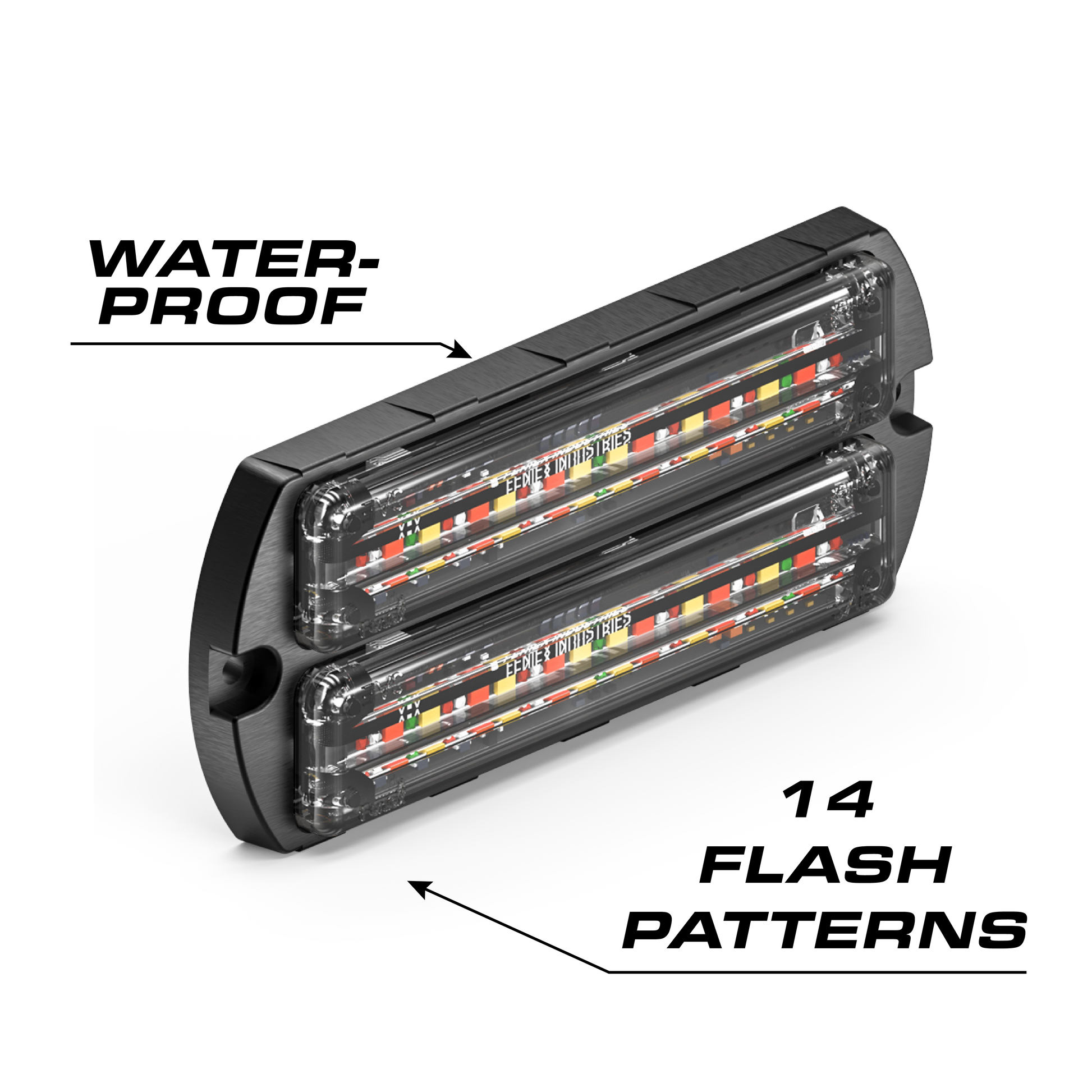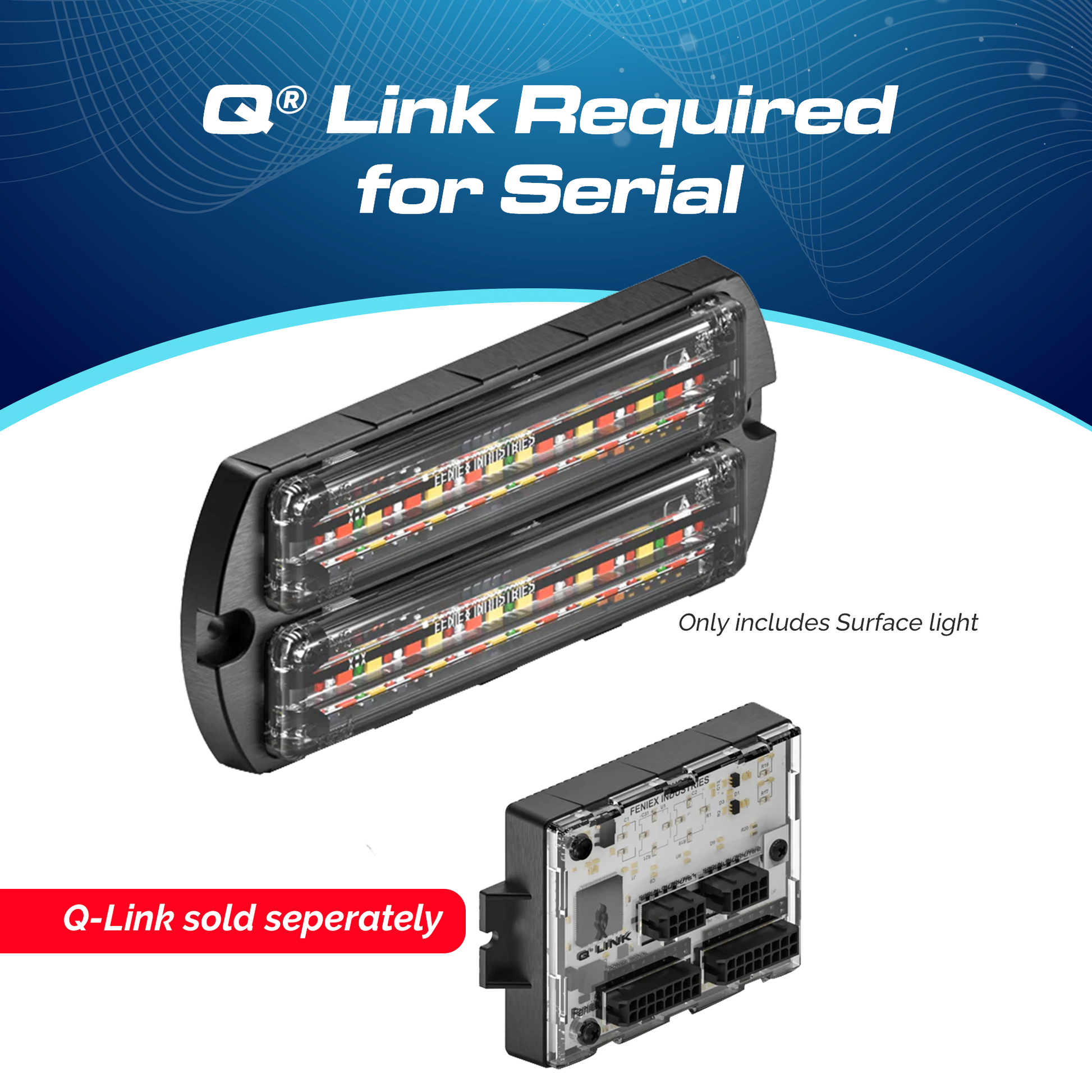 Introducing the Feniex Q Series Flat Dual Surface Mount, the first 5-color, serial perimeter light with vertically stacked light heads for doubled brightness. This sleek surface mount offers Blue, Red, Amber, White, and Green for enhanced safety and visibility. The Q Series 3 Mode is compatible with any 12v switch or controller, it syncs with all Feniex smart modules using 3-mode technology and features bright 60-degree optics. The Feniex Q Serial light heads are built with state-of-the-art serial technology that connects using 2 serial wires to the Q-Link device. You can sync up to 48 light heads to the Q-Link device and program any function and color using our intuitive Q-Link Software. Designed for emergency responders and utility vehicles, it features bright 60-degree optics for clear visibility in any condition. Customize your lighting for urgency, traffic control, or precise work zone illumination.