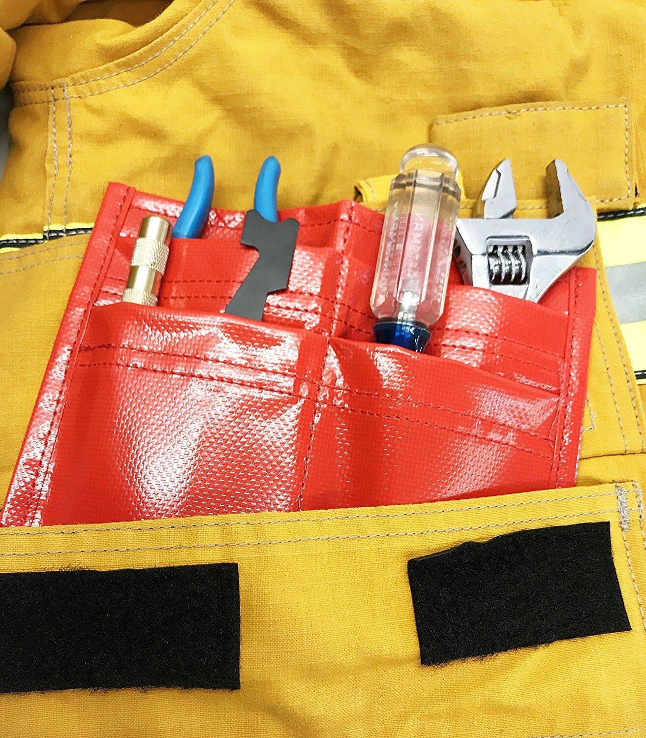 Tool pouch is designed to hold a variety of personal tools from Wedges to Pliers to Screwdrivers. It slides easily into your turnout coat or pants pocket. Measures: 8″W x 7 1/4″H. Prevents rips and tears in bunker-turnout jackets and pants. Tools, Fire Helmet and Jacket are NOT included. Color: Red