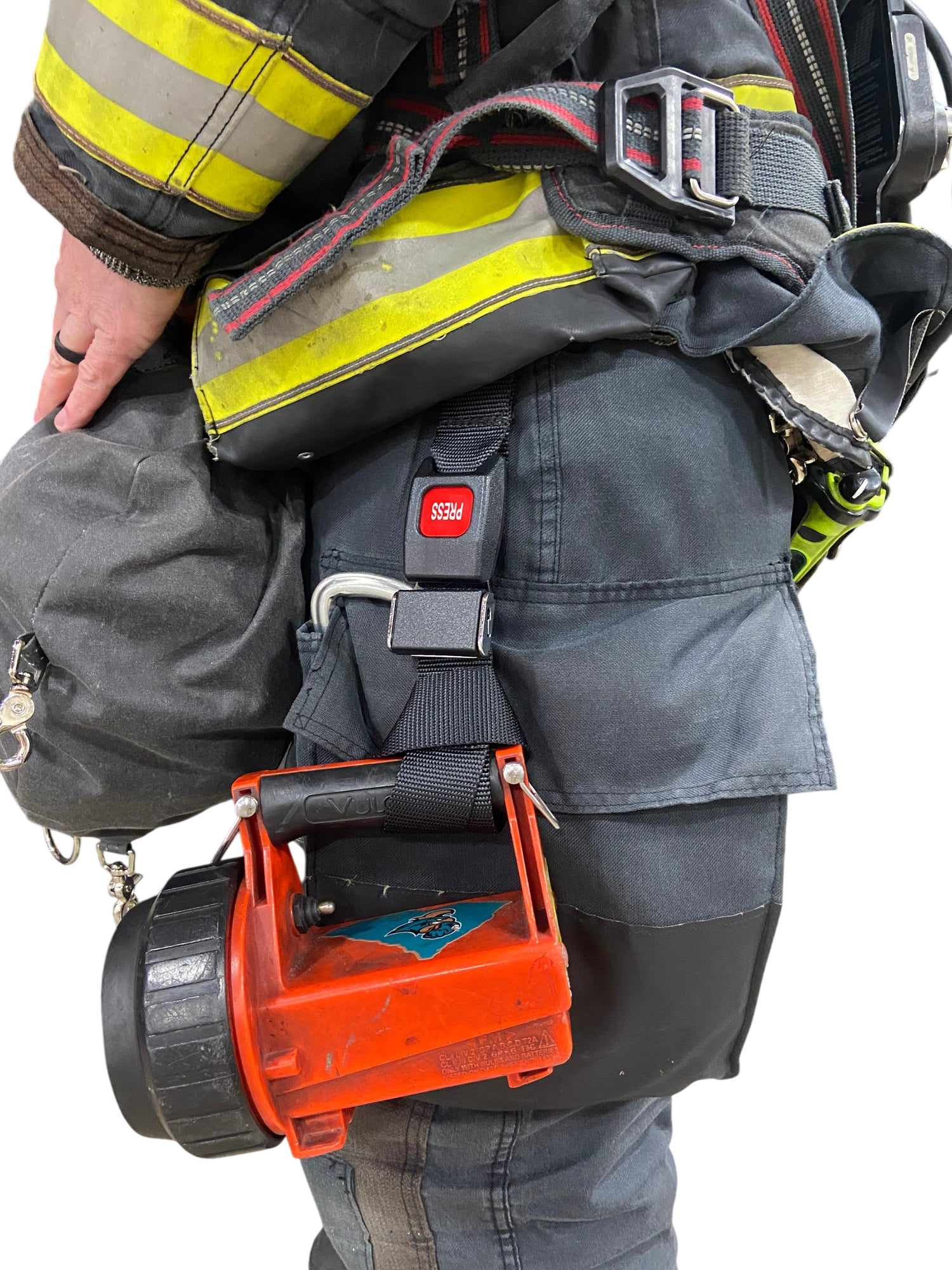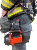 The flashlight strap is a 2-piece strap that allows the firefighter to quickly attach their flashlight to their truck belt without having to wear a sling. It is constructed with a seat belt buckle to allow for quick attachment and release. The female portion of the buckle stays on the firefighter’s truck belt and the male portion stays on the flashlight. The strap is the optimum length and allows manipulation of the flashlight without allowing the light to touch the floor while the firefighter is crawling.