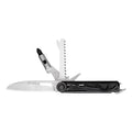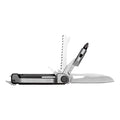 - Additional tools include a plain edge blade, awl, saw, and a bottle opener/prybar.