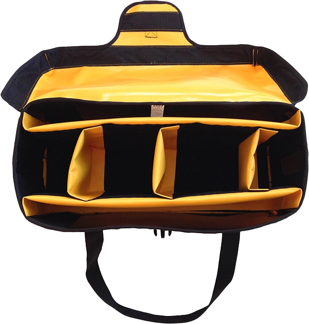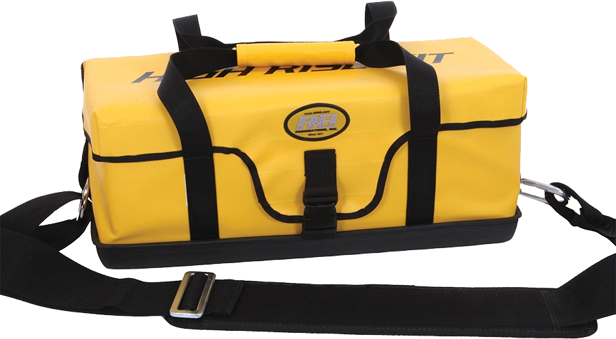 HOUSTON HIGH RISE. #777YL. Designed to carry the tools and adapters needed to combat fire in high rise buildings, the bag is constructed with R&B Fabrication’s Tuff Bottom for superior durability. Outside walls of the bag are constructed of heavy duty, reinforced vinyl, with the inside having rigid plastic inserts to support the bag and help protect the contents. The inserts are Velcro® and able to move, based on the contents. This bag will hold a pipe wrench, spanner wrench, flo-thru pressure gauge, quarter turn valve, wedges, adapters, door straps and rope. It is available in yellow and weighs 110.4 oz. The overall dimensions are 21”L X 9”W X 8 1/2”H with an inside area of 1,606 cubic inches.