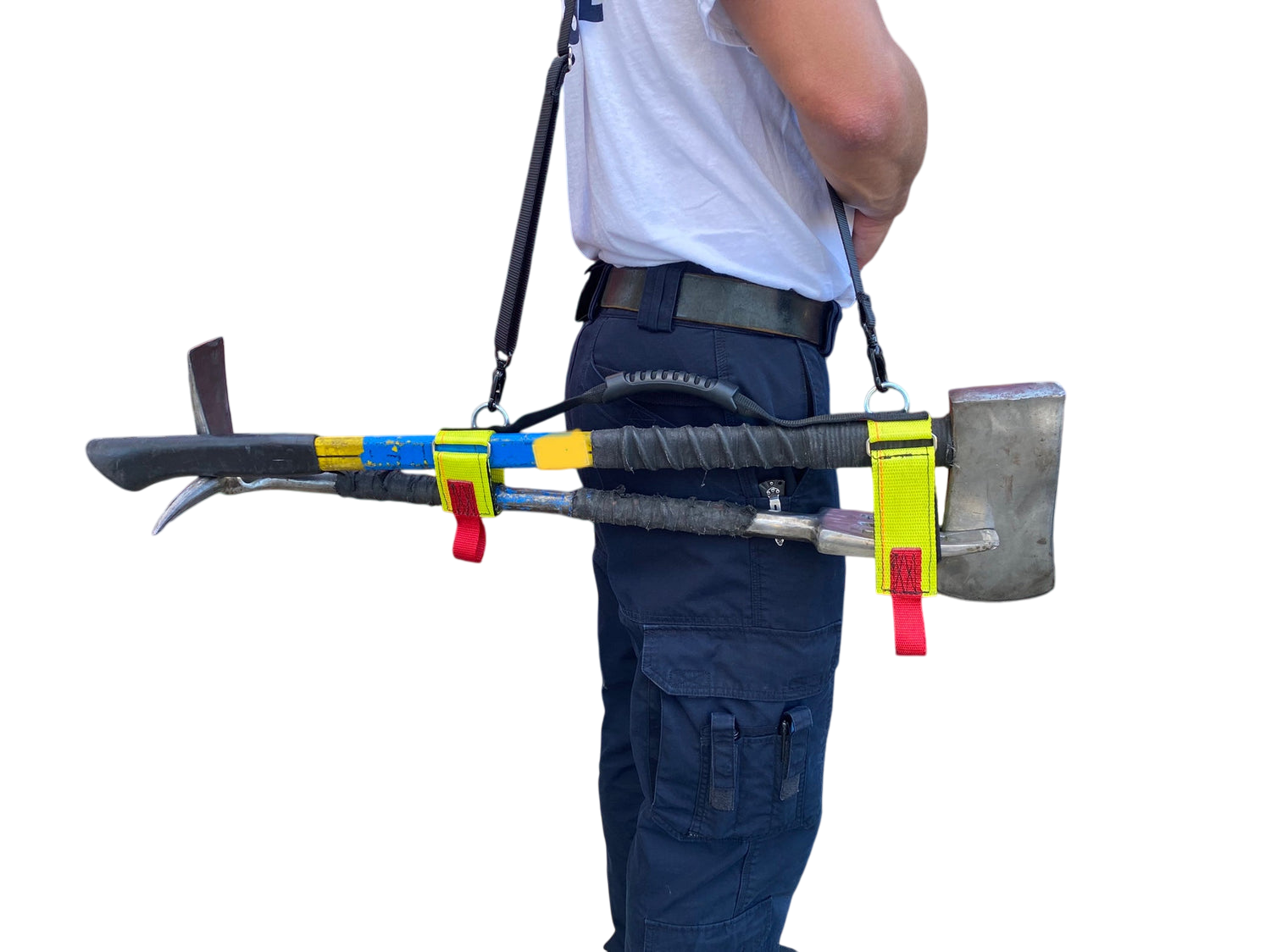 The irons strap secures a flathead axe and halligan bar together with straps that cinch tight and do not allow the strap to slide on the tools. There are 2 easy pull tabs for quick removal of the strap. The 2 carrying options allow the firefighter to carry the tools with a gloved hand or sling the irons over their shoulder for a hands-free option. The design of the strap provides even weight distribution for a more ergonomic carry.