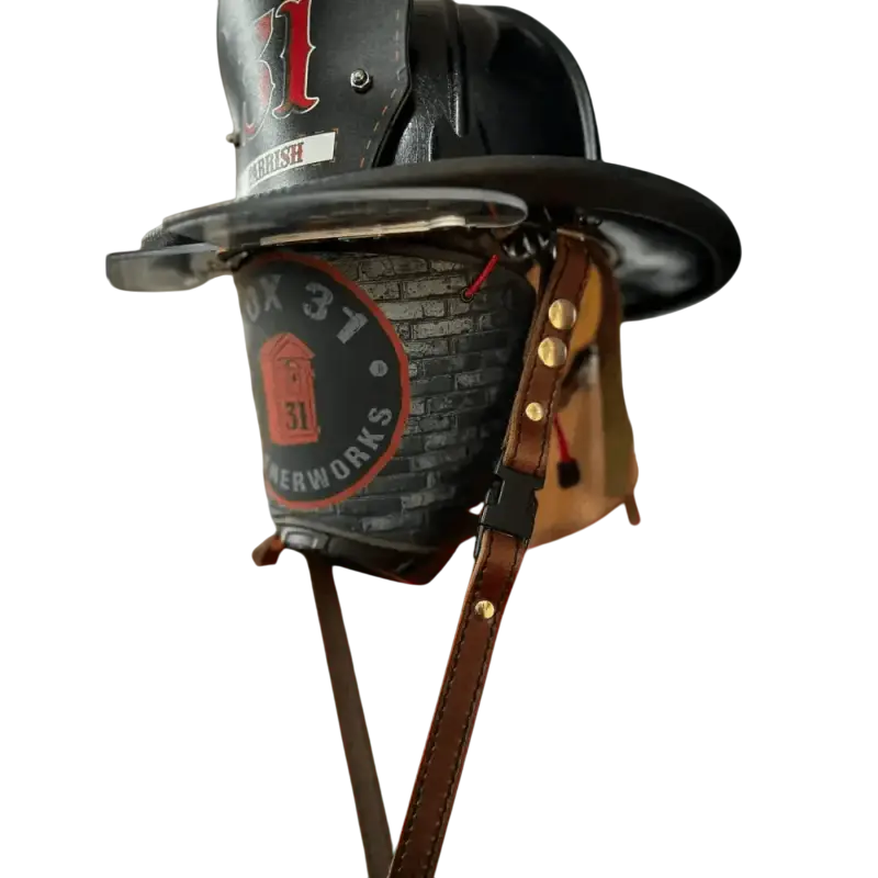OUR LEATHER CHIN STRAPS ARE MADE WITH HIGH QUALITY LEATHER THAT WILL STAND UP TO YEARS OF USE. EACH STRAP WILL BE ASSEMBLED WITH DOUBLE CAP RIVETS. THE ATTACHMENT TO THE HELMET WILL BE EITHER CHICAGO SCREWS OR LINE 24 SNAPS.