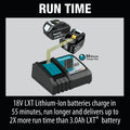 The Makita 18V LXT® Lithium-Ion battery charges faster and works longer than standard lithium-ion batteries, giving you and your cordless tools unmatched performance and productivity to take on the most demanding applications. The Makita 6.0Ah battery, model BL1860B, combines more run time (two-times more run time per charge than the Makita 3.0Ah battery) with a category-leading charge time of only 55 minutes so it spends more time working and less time sitting on the charger. For added convenience, it also features an on-board L.E.D. charge level indicator to monitor battery charge.