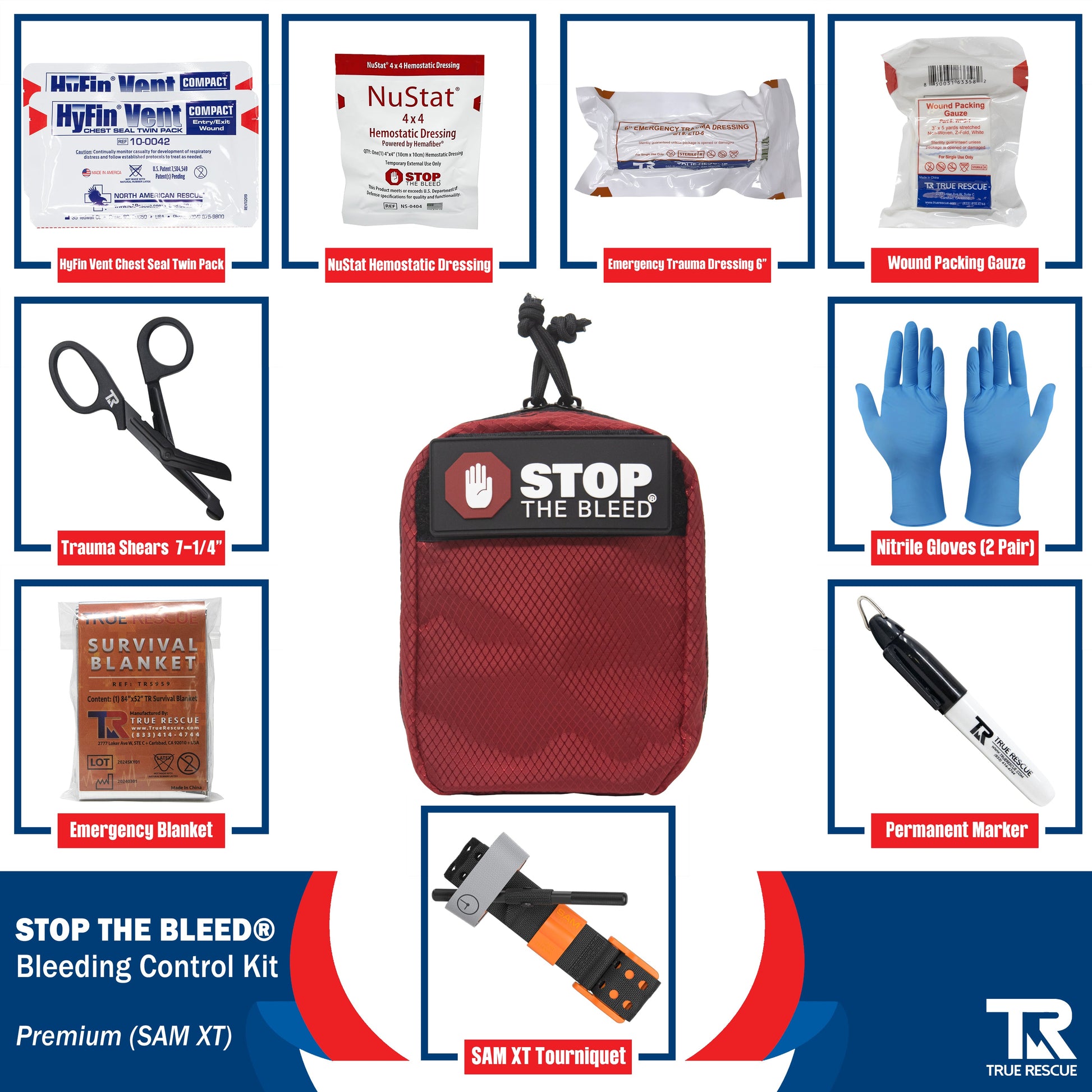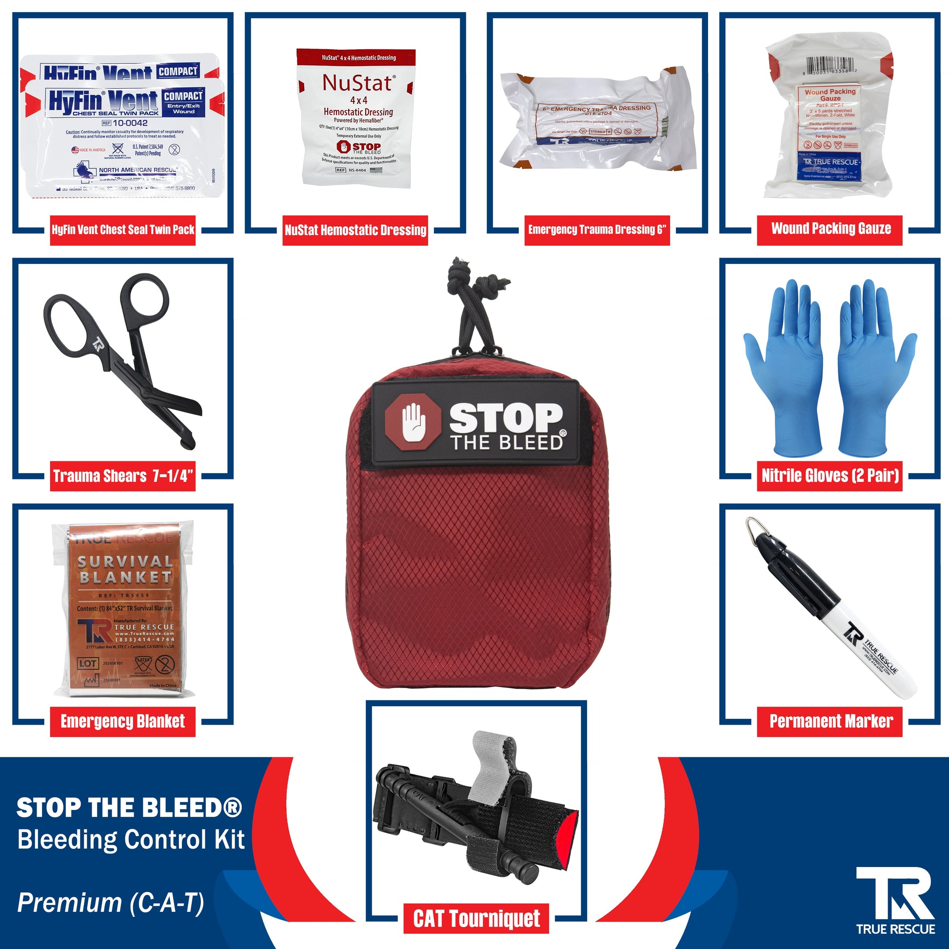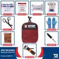 The STOP THE BLEED® Kit by True Rescue® comes in three different variations: Standard, Intermediate, & Premium. Each kit builds upon the last, providing additional life-saving tools to help control major bleeding and traumatic hemorrhaging. Whether you are a civilian preparing your home, school, or place of business; or a professional working in the military, law enforcement, or EMS, you can rest easy knowing there is a life-saving kit here for you!
