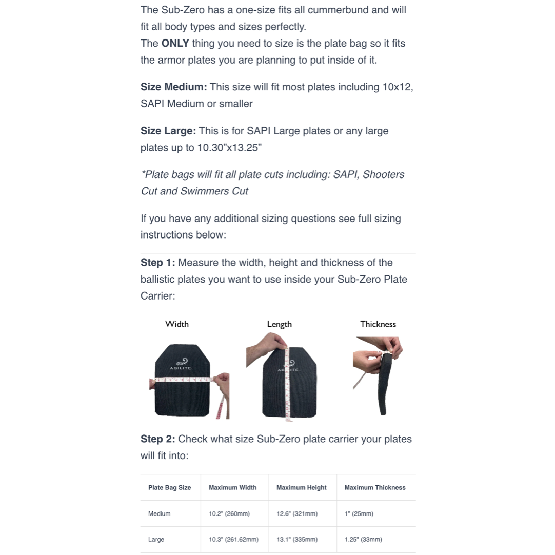 - The ONLY thing you need to size is the plate bag so it fits the armor plates you are planning to put inside of it.