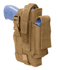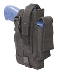 The Elite tactical belt holster was designed to fit most standard pistols with or without a light attached. This versatile gun holster for belts was designed with adjustment points which allow the gun to fit with or without the light attached. This Elite tactical belt holster is constructed of 1000 denier nylon inside and out and has an internal stiffener which holds the holster's shape. The weapon is secured with an adjustable thumb-break retention strap and hook and loop secondary strap for added security. It also has a spare magazine pouch with adjustable lid for secure fit. This gun holster for belts is available in two sizes and fits most full size pistols with light attached. It has two belt slots to fit belts up to 1.75" or up to 2.25" wide. The Elite tactical belt holster is also available in a modular version (see MOLLE product category) and fits most MOLLE vests and packs. As with all Elite products, attention to detail and quality of materials make the Elite Tactical Belt Holster an ideal solution. Available in black, olive drab and coyote tan.