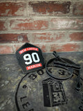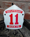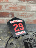 Our Traditional style shield with 1 panel above and 1 panel below with a number in the middle. This leather helmet front has a 2 day lead time. This is the fastest turnaround time for a leather helmet shield on the market.