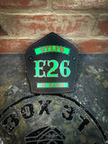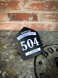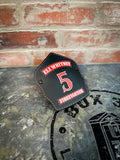 Our Traditional style shield with 1 panel above and 1 panel below with a number in the middle. This leather helmet front has a 2 day lead time.