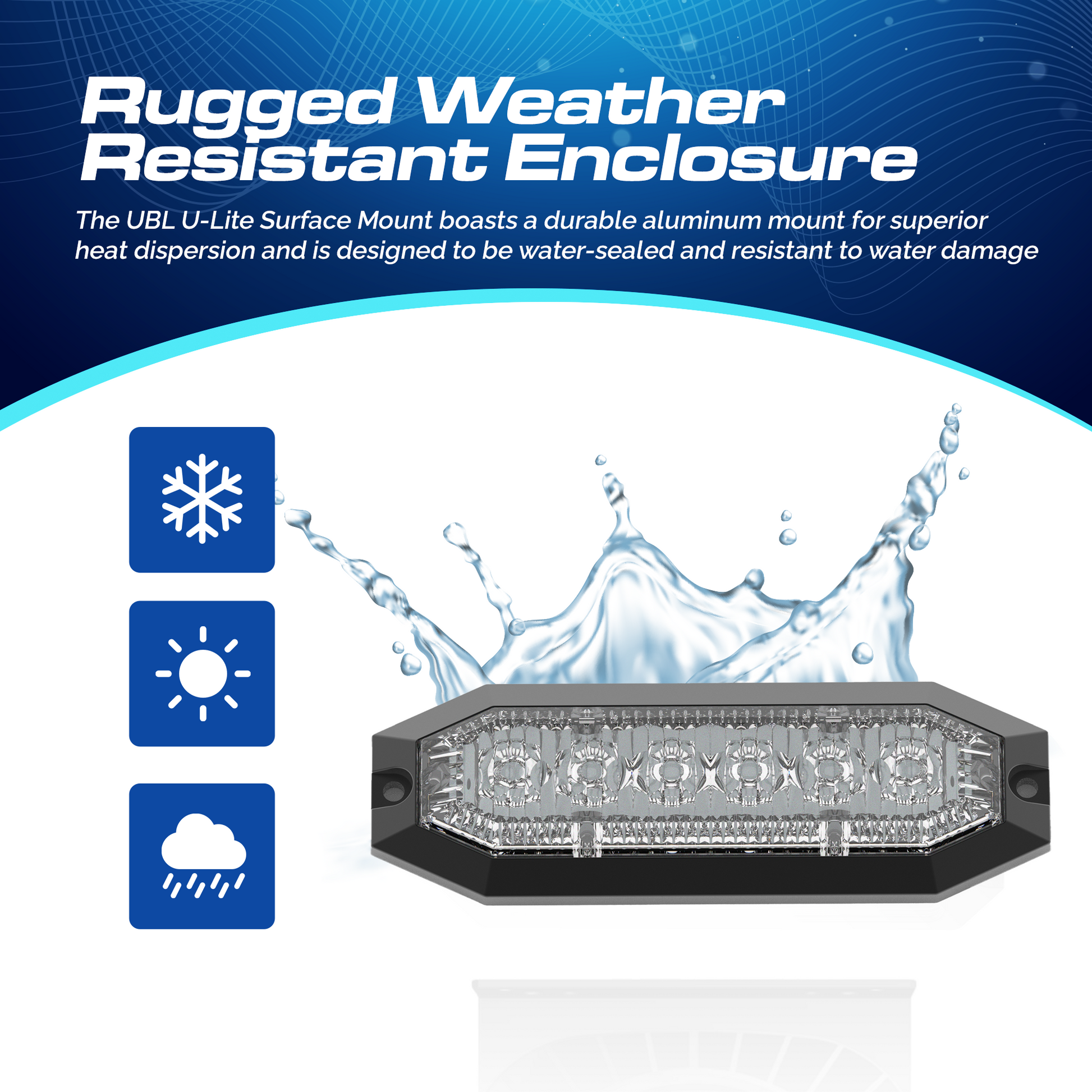 Designed for safety and visibility, the UBL U-Lite Surface Mount is available in amber, blue, red, and white, offering versatility for a wide range of applications. This makes it suitable for various uses, from personal vehicles to professional fleet applications.